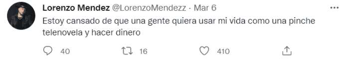 Tras la publicación de las memorias de Janney, mejor conocida como "Chiquis" Rivera, el ex esposo de la cantante de 36 años, Lorenzo Méndez, se ha encargado de responder a través de indirectas las declaraciones que ella hizo en su nuevo libro.La hija de Jenny Rivera confesó en las páginas del libro "Invencible" que su matrimonio con el integrante de "La Arrolladora Banda El Limón" fue fugaz, debido a que hubo violencia y adicciones que ella no soportó."Estoy cansado de que una gente quiera usar mi vida como una pinche telenovela y hacer dinero", escribió Méndez en Twitter.Aunque ninguno de los dos mencionó nombres muchos fans identificaron la molestia con correspondencia a quien fuera su esposa por un año. "No te dejes de Chiquis" y "Lamentablemente Chiquis no te supera", fueron algunos de los comentarios que recibió el cantante.Mientras que Janney recurrió a la misma red social para expresar su sentir con un contundente mensaje en el que se lee: "Es una locura hasta dónde llegan algunas personas para causar controversia intencionalmente y obtener algún tipo de atención".Ambos intérpretes estuvieron casados de junio del 2019 a septiembre del 2020; su separación se vivió entre controversias de abusos y aún no han firmado legalmente, pero en junio del 2021 él mismo afirmó para una cadena de televisión estadounidense que no había terminado el proceso porque él quería dejar establecidas unas cláusulas para proteger su privacidad."Creo que si el amor fue real hay que protegerse con ciertas cláusulas de no hacer libros y otras cosas", señaló el cantante.AF