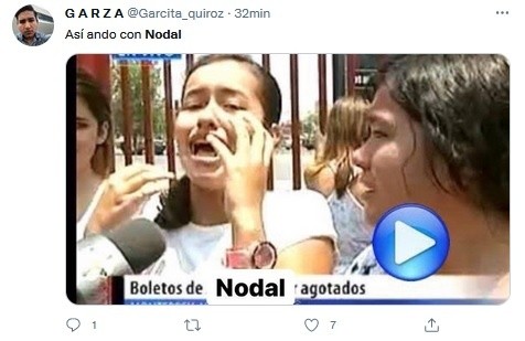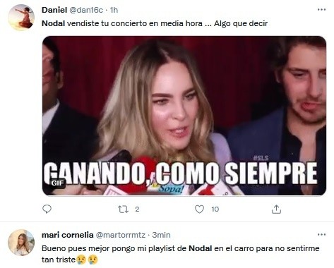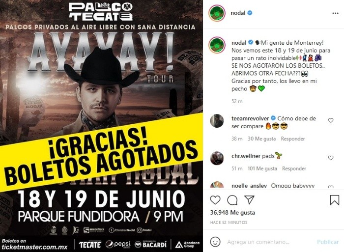 El cantante Christian Nodal se hizo tendencia en las redes sociales después de que se terminaran los boletos paras su concierto en Monterrey.La mañana de este viernes salieron a la venta los boletos para su espectáculo del próximo 18 y 19 de junio en el Parque Fundidora, sin embargo los tickets se terminaron a los minutos.En Twitter seguidores del cantante de "Adiós amor" mostraron su molestia y compartieron memes.Por su parte, Nodal emocionó a sus fans con abrir otra fecha.En su cuenta de Instagram agradeció el apoyo "Gracias por tanto, los llevo en mi pecho", escribió en una publicación.El cantante compartió una imagen y lanzó la pregunta si abriría una nueva fecha."Mi gente de Monterrey! Nos vemos este 18 y 19 de junio para pasar un rato inolvidable. SE NOS AGOTARON LOS BOLETOS.. ABRIMOS OTRA FECHA???", se lee.La publicación recibió más de 30 mil "me gusta" y decenas de comentarios a favor de que abra otra fecha.
