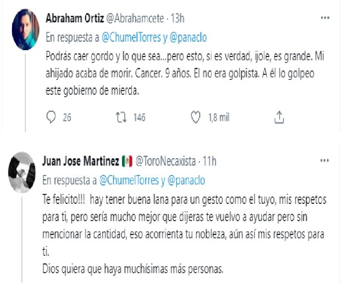 El gesto solidario de Chumel Torres está generando comentarios positivos entre los cibernautas, el conductor, uno de los más amados y a su vez odiados de internet y las redes sociales, se sumó a una buena causa relacionada con ayudar a un niño que padece cáncer.A través de Twitter se hizo viral el caso de Jonathan, un pequeño que padece cáncer y que necesita recaudar 150 mil pesos para un trasplante de médula; al llamado de ayuda, Chumel respondió que daría 50 mil pesos."Amigos él es Jonathan, su familia requiere con urgencia recaudar 150 mil pesos para su trasplante de médula. Apenas llevan 50 mil. Apelo de nuevo a su gran corazón para sus donaciones o darle difusión a este tuit", se lee.Tras la respuesta de Chumel, el futbolista Miguel Layún también expresó su deseo de ayudar a Jonathan con la aportación de más dinero.Cibernautas felicitaron a Chumel y muchos de ellos reconocieron que independientemente de cómo les caiga, era de aplaudirse su solidaridad ante esta causa tan lamentable como es el cáncer infantil."Podrás caer gordo y lo que sea pero esto, si es verdad, híjole, es grande. Mi ahijado acaba de morir. Cancer. 9 años. El no era golpista. A él lo golpeo este gobierno de mierda"."Ojalá hubiese más figuras públicas 'clasistas' y 'racistas' como tú. Eso en verdad es la definición de ser humanista y no el liberar narcotraficantes Eso es más útil que hacer un movimiento de 'prietura' para dividir y exhibir complejos. ¡Bravo!"."Te felicito, hay tener buena lana para un gesto como el tuyo, mis respetos para ti, pero sería mucho mejor que dijeras te vuelvo a ayudar pero sin mencionar la cantidad, eso acorrienta tu nobleza, aún así mis respetos para ti. Dios quiera que haya muchísimas más personas", son algunos de los comentarios.El presentador, comediante y youtuber mexicano, conductor del programa "El Pulso de la República", ha sido un acérrimo crítico del gobierno actual, y aunque en esta ocasión, su gesto generó reconocimiento por parte de los usuarios en redes sociales, en muchas otras ocasiones, ha sido tachado de clasista, elitista y racista.En junio del año pasado, mucha gente en redes sociales reaccionaron en contra de una invitación que le hicieron al foro ¿Racismo y/o clasismo en México?, organizado por el Consejo Nacional Para Prevenir Discriminación (Conapred).Usuarios comenzaron a difundir mensajes del comunicador, como la burla que hizo sobre un niño quemado; comentarios en que se refería a las mujeres como perras y el señalamiento de acoso por parte de una mujer.Cibernautas recordaron cuando Chumel difundió durante la actual contingencia la imagen de un presunto médico fallecido por el COVID-19, cuando realmente era la imagen de Valentín Elizalde y, tras ser recriminado por el IMSS, respondió que no aguantaban una broma.Esa misma semana, en la que finalmente el Conapred canceló el foro en el que participaría Chumel, él exclamó en su programa: "Trabajen más, tenoches", lo cual muchos interpretaron como un mensaje al actor Tenoch Huerta, quien continuamente retoma el tema de discriminación.En medio de la polémica, Beatriz Gutiérrez Müller, esposa del presidente de México, Andrés Manuel López Obrador, recordó cuando Torres insultó a su hijo.El conductor, ingeniero mecánico que se desempeñaba como project manager en una maquila de equipos médicos en Chihuahua hace ocho años, se disculpó aduciendo que lo hacía por ser una madre que se sentía afectada.En entrevista con EL UNIVERSAL en diciembre del 2020, Chumel reconoció la importancia que en estos tiempos tiene lo que se publica en las redes sociales, principalmente en Twitter, donde se han desatado todo tipo de discusiones y polémicas, y donde ahora él también es generador de conversación y provocador de aplausos, críticas y odio."Se nota más nuestra polarización y el enojo en ciertas redes, porque tú por ejemplo vas a Instagram y es puro amor y paz, gente en bikini; vas a Tik Tok y es gente bailando y haciendo tonterías; Facebook son tías confundidas, pero Twitter es la red madre donde se generan las noticias, se han desatado guerras a través de Twitter, las declaraciones que se hacen son oficiales y son como tu voz, y es muy importante por eso, porque cualquier cosa que digas es tu pensamiento y puede traer consecuencias cabronas. Tiene más eco, pero también yo lo veo como algo positivo, ya no te lo crees tanto", expresó.A pesar del gran trampolín de las redes sociales, el YouTuber admitió que es importante no regarla, pues Internet recuerda todo y nadie puede escapar a ello."Si no fuera por las redes sociales, no estaría aquí un servidor, que para bien o para mal yo nací de Twitter y después de YouTube y ahora todas estas cosas que hacemos, se me hace que es una democratización de la comunicación. Esto es padre porque Internet no olvida y todo lo que digas será usado en tu contra, pues procura no cagarla en las redes", recomendó".MF