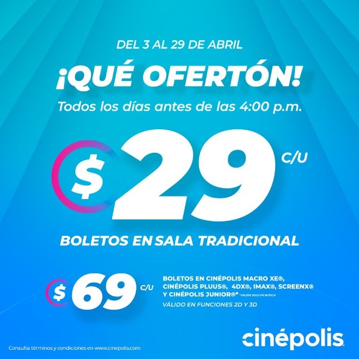 Cinépolis anunció una increíble oferta con entradas a tan solo 29 pesos para que puedas ir a ver tus pelis favoritas en la pantalla grande a un precio accesible, es por ello que aquí te compartimos cuándo y en qué horarios aplicar esta promoción. A partir del 3 de abril al 29 del mismo mes, Cinépolis tendrá sus entradas a 29 pesos en sus salas tradicionales de toda la Republica Mexicana.Mientras que para sus cines IMAX, 4DX, SCREENX, Cinépolis Pluus, Macro XE, Cinépolis Junior (solo butaca), las entradas tendrán un precio de 69 pesos. Cabe destacar que solo participan funciones 2D y 3D y NO forman parte de la promoción los conjuntos Cinépolis VIP.A través de un comunicado, Cinépolis informó que los boletos a 29 pesos aplican únicamente para funciones de matinés, es decir las películas que se exhiban antes de las 4:00 pm. Para poder comprar tus entradas a 29 pesos puedes hacerlo a través de taquilla, página web, app, kioscos y/o taquillas automáticas y con cualquier forma de pago disponibles, incluyendo pago con puntos Club Cinépolis (total o parcial).• No se puede combinar con otras promociones, descuentos, cupones o precios especiales, tales como los de miércoles, días festivos, estudiantes, menores de 12 años, combo lunes Club Cinépolis, martes 2x1 con tarjeta Club Cinépolis, personas de la tercera edad, o cualquier otra promoción que determine Cinépolis.• No aplica para funciones en Cinépolis VIP. • No es válida en premieres, preventas, funciones especiales, festivales o contenido alternativo +Que Cine Cinépolis. • La promoción podría no ser válida en otras programaciones determinadas por el organizador, las cuales se pueden consultar en el cine de su preferencia, o no será posible aplicar el precio promocional al realizar la compra. • No aplica en salas con butacas dobles o cuádruples. • El precio es en moneda nacional (M.N.) e incluye IVA. • No es acumulable. • Esta promoción no se puede combinar con beneficios del programa de lealtad Club Cinépolis, salvo el pago con puntos Club Cinépolis (total o parcial). • Sujeta a disponibilidad de espacio en sala y clasificación de la película. • Podría haber un número limitado de boletos disponibles.Para más información conoce los términos y condiciones de Cinépolis.NA