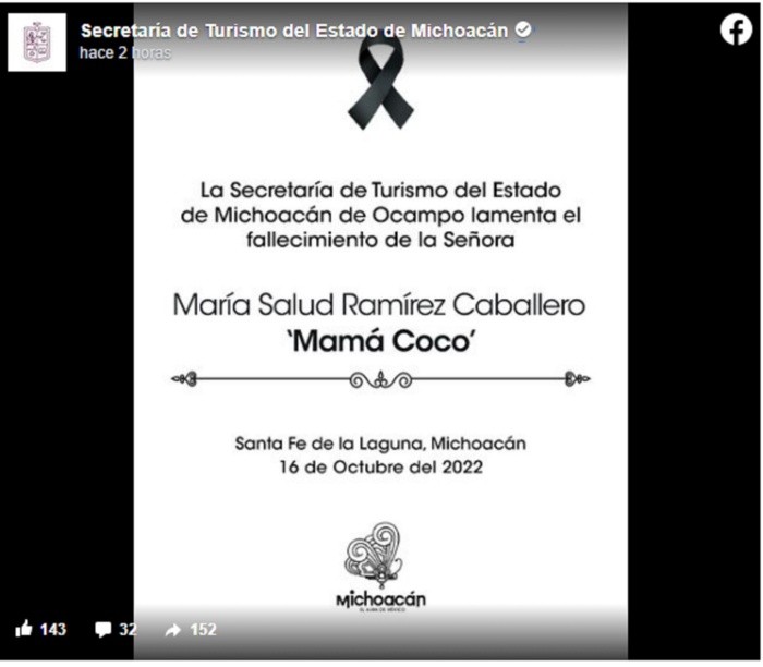 La señora María Salud Ramírez Caballero, quien inspiró al personaje de "Mamá Coco" en la película de Disney Pixar, falleció a los 109 años de edad en Santa Fe de la Laguna, Michoacán, así lo dio a conocer Roberto Monroy, Secretario de Turismo del Estado de Michoacán. Roberto Monroy compartió la noticia a través de su cuenta de Twitter, lamentando el fallecimiento de Doña María."Lamento profundamente el fallecimiento de Doña María Salud Ramírez Caballero, 'Mamá Coco', mujer incansable y ejemplo de vida, quien fuera inspiración para este amado personaje que dio la vuelta al mundo. Mis oraciones para su descanso y para que su familia encuentre resignación", escribió Monroy.De igual forma, la Secretaría de Turismo en su página de Facebook compartió una imagen lamentando la muerte de “Mamá Coco”.Hasta el momento no se sabe cuál fue la causa de muerte, quien en su tiempo de juventud se dedicó a la alfarería al igual que su marido, y que además recientemente había cumplido años el pasado 16 de septiembre.MF