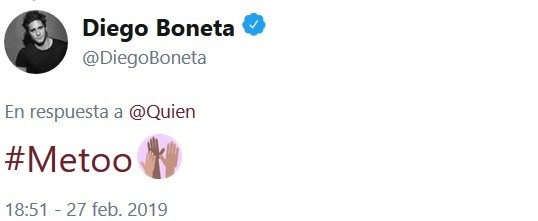 Un video en redes sociales se viralizó luego de que una conductora y actriz chilena diera un beso al actor Diego Boneta durante una entrevista.En el material aparece Daniela Palavecino entrevistando al protagonista de la serie de Luis Miguel que asistió a la inauguración del Festival Viña del Mar."Jesucristo, está Diego Boneta, me va a dar algo, me va a dar algo", se escucha en el material."Te ves guapísima, me vas a poner del color de tu vestido", señaló Boneta.Palavecino señaló que en Chile había una tradición entre los presentadores. "Los animadores con la animadora todas las primeras noches como Kabalah se dan un beso en la boca. ¿Sabías eso?" por lo que el actor contestó que no.La conductora preguntó a Diego si estaba dispuesto a cumplir la "tradición", por lo que el actor sin dudarlo respondió que sí.El video causó polémica en redes sociales y seguidoress del actor calificaron el acto como acoso.Diego Boneta contestó un tuit sobre la nota de un medio de espectáculos y escribió "#MeToo", haciendo referencia al movimiento para demandar el acoso .JB