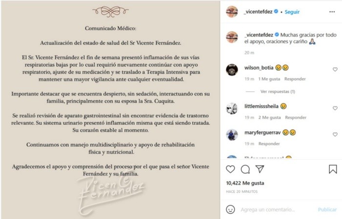 Antes de las 22:00 horas de la noche de hoy, en la cuenta de Instagram del cantante Vicente Fernández, se publicó un nuevo parte médico donde se confirma que sí regresó a terapia intensiva debido a la inflamación de sus vías respiratorias bajas.“El Sr. Vicente Fernández el fin de semana presentó inflamación de sus vías respiratorias bajas, por lo cual requirió nuevamente continuar con apoyo respiratorio, ajuste de su medicación y se trasladó a terapia intensiva para mantener una mayor vigilancia ante cualquier eventualidad”.Sin embargo, en el comunicado resaltan que el cantante se encuentra despierto, sin sedación e interactuando con su familia, principalmente con su esposa, la señora Cuquita.“Se realizó revisión de aparato gastrointestinal sin encontrar evidencia de trastorno relevante. Su sistema urinario presentó inflamación, misma que está siendo tratada. Su corazón estable al momento. Continuamos con manejo disciplinario y apoyo de rehabilitación física y nutricional”, se explica.Finalmente se resalta en la información difundida el apoyo y la comprensión por el proceso médico que actualmente vive “El Charro de Huentitán”.JM