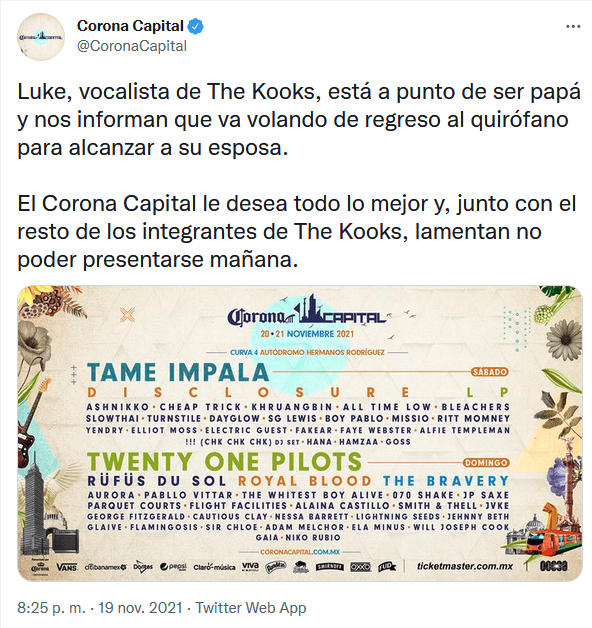 A unas horas de que inicie el festival musical Corona Capital 2021, el evento anunció la cancelación de The Kooks, una de las bandas principales del cartel de este sábado 20 de noviembre.¿El motivo? Luke Pritchard, el vocalista del grupo, tomó un vuelo de último momento porque su esposa ya iba a dar a luz."Luke, vocalista de The Kooks, está a punto de ser papá y nos informan que va volando de regreso al quirófano para alcanzar a su esposa", publicó Corona Capital en su cuenta de Twitter.La noticia fue agridulce, porque así como el evento daba sus mejores deseos al cantante, también informó a los fans que se cancelaba la presentación de The Kooks.Muchos fans y asistentes expresaron su tristeza en redes sociales, pero también enojo. Algunos lamentaron que las fechas del nacimiento del bebé y del festival se hayan empalmado, otros etiquetaron a la Profeco para denunciar que el festival no cumple con lo acordado, mientras que otros destacaron que la banda "se la pasa cancelando en la CDMX". Algunos asistentes se resignaron y declararon que con Tame Impala y Disclosure aún se salva el evento. The Kooks estaba programado para cerrar en el escenario Corona Cero de las 21:10 hrs. A las 22:10 hrs. Su presentación coincidía con la de Disclosure, quienes se presentarán a las 20:50 hrs y concluirá a las 22:05.Tame Impala se mantiene como el grupo principal, que cerrará el primer día de la esperada edición del Corona Capital 2021, el primer festival musical en la Ciudad de México, después del confinamiento por la pandemia de COVID-19.OF