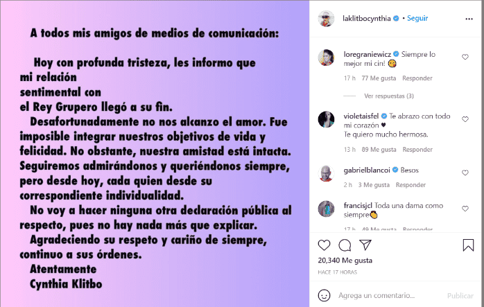 Cynthia Klitbo y el Rey Grupero dieron por concluido su romance que comenzó hace ocho meses, a través de un mensaje en redes sociales, la actriz informó que la relación amorosa con el youtuber había llegado a su fin, pues "desafortunadamente, el amor no alcanzó".Klitbo y Luis Alberto Ordaz, nombre real del Rey Grupero, sorprendieron a sus seguidores cuando dieron a conocer públicamente su romance en octubre del 2020, pues posteó una íntima fotografía en la que posaron desnudos en una cama.Su relación estuvo muy cercana a los cibernautas, pues mientras la actriz estuvo trabajando fuera de México, sus fans fueron testigos de los románticos reencuentros de la pareja.Sin embargo, Cynthia Klitbo aclaró que la relación de amistad entre ellos sigue intacta, a pesar de que el romance ya no pudo continuar debido a que ambos tienen objetivos de vida distintos.La actriz de 54 años enfatizó que no daría ninguna otra declaración, pues no hay nada más que agregar sobre el tema."Hoy con profunda tristeza, les informo que mi relación sentimental con el Rey Grupero llegó a su fin. Desafortunadamente no nos alzanzó el amor. Fue imposible integrar nuestros objetivos de vida y felicidad. No obstante, nuestra amistad sigue intacta. Seguiremos admirándonos y queriéndonos siempre, pero desde hoy, cada quien desde su correspondiente individualidad. No voy a hacer ninguna declaración pública al respecto, pues no hay nada más que explicar".Recientemente, la actriz platicó sobre diversos episodios de abuso que le tocó vivir cundo era una niña, como cuando a los 14 años fue violentada sexualmente por su novio de ese entonces, o cuando militares del Campo Marte la acosaron mientras estudiaba en la Escuela Nacional de Danza."Me tocaba ir a la escuela atrás del Auditorio Nacional, la cantidad de degenerados que nos acosaban a mis amigas y a mí. Muchas veces los militares del campo Marte se pegaban a las ventanas y ellos nos enseñaban todo, porque eran los vidrios transparentes y nadie hacía nada", recordó la actriz.Klitbo, que desde pequeña le tocó aprender a cuidarse, porque no contó con la compañía de su madre, también relató que un exgobernador del Estado de México intentó abusar de ella."Me llamaron a la oficina de esta persona que en su momento era el gobernador. Mi mamá siempre estaba trabajando y yo siempre estaba sola, a mí no me llevaba mi mamá. Entonces de pronto estábamos en Virreyes y dije 'qué hacemos por aquí' y me dijo 'no pues vamos a subir por el licenciado'. De repente se desaparecieron los guaruras y yo acabé correteada, picándole al elevador y llegué llorando con mi mamá y le conté", aseguró.Gracias a su madurez la actriz de melodramas como "La dueña", "El privilegio de amar" y "Teresa", ahora puede platicar de estos pasajes de su vida sin problemas, porque según ella ya sorteó todo lo que tenía que pasar."Es una desgracia, pero todavía de vieja, hace poco me agarraron las pompas. Entonces no voy a decir nombres, a mí no me interesa acusar a nadie, porque acabaría mucho medio artístico en la cárcel, pero es una cosa que se da en todos los niveles", consideró.NR