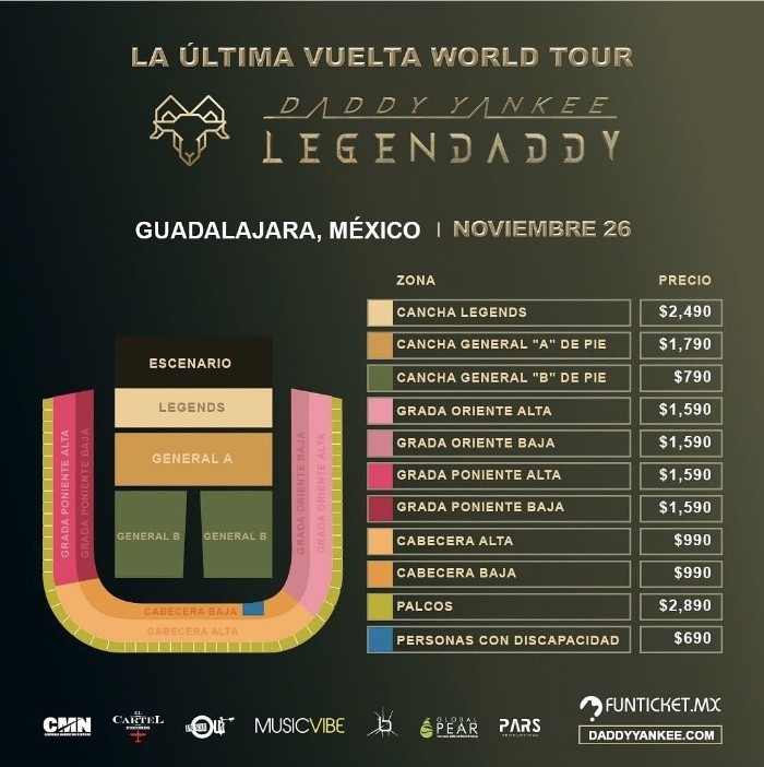 El astro boricua, Daddy Yankee, llegará a Guadalajara el próximo 26 de noviembre con su gira “La Última Vuelta World Tour” para presentar su reciente material discográfico “Legendaddy”.La venta de boletos a través de funticket.mx comenzará el próximo 13 de abril a partir de las 10:00 horas.Esta gira es todo un suceso pues Raymond Ayala de 45 años ha advertido que: “Esta carrera, que ha sido un maratón, al fin veo la meta. Ahora voy a disfrutar con todos ustedes lo que me han dado, lo que me han regalado”, advirtiendo su retiro de la música, noticia que conmocionó a la audiencia.“Formalmente anuncio mi retiro de la música, entregándoles mi mejor producción y mi mejor gira de conciertos, y los voy a despedir estos 32 años de trayectoria con esta pieza de colección, titulada 'Legendaddy'”, esta declaración la dio cuando anunció la llegada de su reciente disco donde colabora con estrellas del calibre de Bad Bunny, Natti Natasha, Becky G y Pitbull, entre otros.Pero, ¿cuánto costarán los boletos para ver a Daddy Yankee en Guadalajara?AC