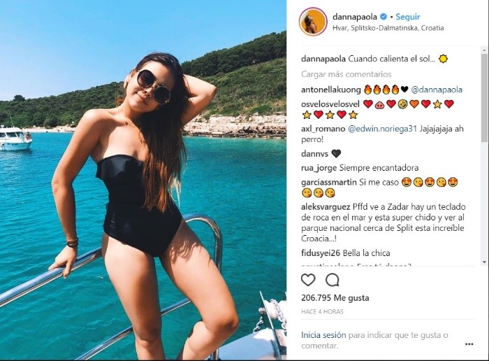 Danna Paola compartió en su cuenta de Instagram una fotografía en traje de baño que alborotó a sus seguidores en Instagram.La actriz de 22 años de edad posa en un yate y luce su figura en un traje de baño color negro; acompañó la instantánea con el mensaje: "Cuando calienta el sol"."Te amo eres muy hermosa", "Que mujer más hermosa eres @dannapaola creciste muy rápido", "Hola Danna. Es imposible dejar de verte eres encantadora. Una reina", fueron algunos de los comentarios.Recientemente, Danna Paola llegó a los 5 millones de seguidores en Instagram y celebró con una instantánea en traje de baño.JA
