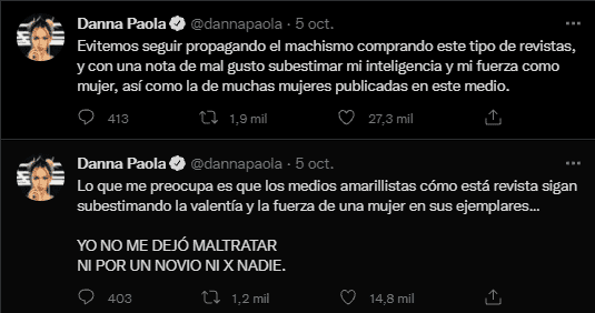 Danna Paola al fin rompió el silencio sobre los rumores de maltratos que recibe de su supuesto novio Alex Hoyer, luego de que un medio difundiera que la cantante vivía en “una delicada situación de violencia” por celos en lo profesional.Ante esto, Danna Paola no se quedó callada y optó por hablar al respecto a través de Twitter, sin confirmar que Hoyer es su pareja sentimental.“Yo no me dejo maltratar ni por un novio ni x nadie”, escribió Danna Paola luego de criticar a la revista que publicó la información.Danna Paola agregó que: “Evitemos seguir propagando el machismo comprando este tipo de revistas, y con una nota de mal gusto subestimar mi inteligencia y mi fuerza como mujer, así como la de muchas mujeres publicadas en este medio”.La publicación de Danna Paola fue bien recibida por sus seguidores, quienes brindaron su apoyo luego de la polémica. Alex Hoyer es conocido por participar en “La Voz” en su edición de 2014.Hay que recordar que TVnotas compartió en 2014 un video donde Danna y Eleazar Gómez se les ve discutiendo, cuando ambos eran pareja.AC