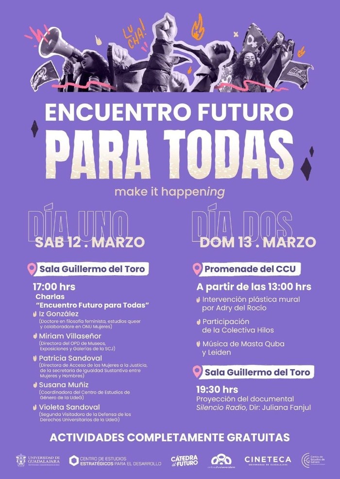 Este 8 de marzo (8M), las mujeres de todo el mundo salen a las calles para conmemorar el Día Internacional de la Mujer para pedir igualdad y seguridad para todas, por ello, a partir de este día, se realizan actividades, como es el caso de la Cineteca FICG y en Centro Cultural Universitario de la UdeG con “Encuentro Futuro Para Todas”. Se trata de dos días de actividades y charlas completamente gratuitas en la Cineteca FICG, ubicada en Periférico Norme Manuel Gómez Morin. La cita será el próximo sábado 12 y domingo 13 de marzo, con la participación de Leiden y Masta Quba.Charla “Encuentro Futuro Para Todas”Música de Masta Quba y LeidenAC