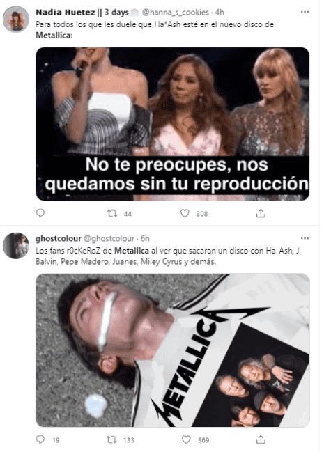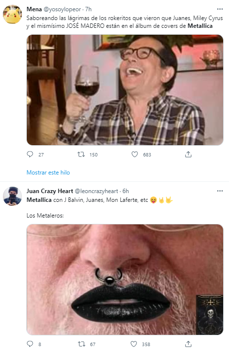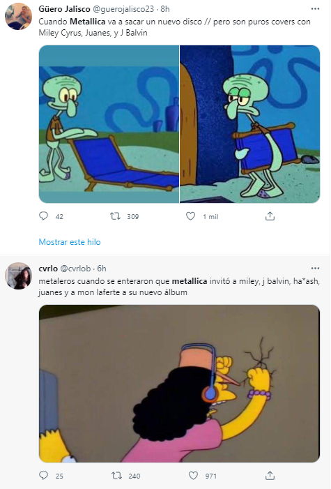 Metallica celebra este 2021 el 30 aniversario de su "The Black Album", y como festejo invitó a más de 50 artistas que incluyen a Juanes, Mon Laferte y J Balvin, para la reedición del disco."The Metallica Blacklist" cuenta con la participación de 53 artistas de diferentes géneros, generaciones y culturas que hicieron versiones de las canciones del álbum homónimo de Metallica conocido popularmente como "The Black Album". "The Metallica Blacklist" saldrá a la venta el 10 de septiembre.Los dos primeros sencillos del disco son "Enter Sandman", interpretada por Juanes, y "Nothing Else Matters", interpretada por Miley Cyrus con WATT, Elton John, Yo-Yo Ma, Robert Trujillo y Chad Smith.El dúo Ha*Ash dará su voz a "The Unforgiven" y el Instituto Mexicano del Sonido hará una versión de "Sad But True" con La Perla y Gera MX. Mon Laferete, en tanto, interpretará "Nothing Else Matters".Las ganancias de las ventas del álbum serán destinadas a diferentes organizaciones benéficas, entre ellas All Within My Hands de Metallica y la Fundación Mi Sangre de Juanes.Balvin, que estará a cargo de "Wherever I May Roam", destinará las ganancias de su canción al Hospital de Investigación Infantil St Jude y a All Within My Hands.Entre otros, Rodrigo y Gabriela hacen una versión de "The Struggle Within" y José Madero de "The Unforgiven". St. Vincent, Dave Gahan, Alessia Cara y The Warning son otros de los artistas participantes.Las celebraciones por "The Black Album" también incluirán una nueva versión remasterizada del disco original.Previamente Juanes había hecho un cover de "Seek and Destroy" en el Festival Rock al Parque en Bogotá en 2019 y, ese mismo año, Lars Ulrich de Metalliza le entregó al colombiano el premio a la Persona del Año en la ceremonia de los Latin Grammy.La noticia del nuevo material no fue bien recibida por algunos fan y las reacciones por supuesto no se hicieron esperar haciendo viral el tema en redes sociales con divertidos memes: NR