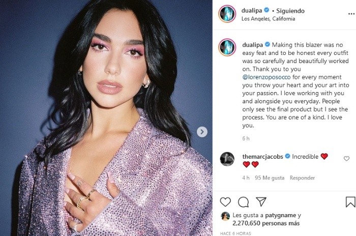 La superestrella Dua Lipa no solo es reconocida por su talento en la música, también por marcar un referente en cuanto a moda se refiere. En la pasada entrega del Grammy, la casa de moda que se encargó de vestirla, como siempre, fue Versace, sin embargo, el que creó la magia en los looks en cuanto a la coordinación de estos, fue su stylist Lorenzo Posocco.En redes sociales Dua hizo público su reconocimiento. "Hacer este blazer no fue tarea fácil y, para ser honesta, cada atuendo fue trabajado con mucho cuidado y belleza. Gracias Lorenzo Posocco por cada momento en el que entregas tu corazón, tu arte y tu pasión. Me encanta trabajar contigo todos los días". Y remató al expresar que "La gente solo ve el producto final, pero yo veo el proceso. Eres único en tu clase. Te amo".Y tiene razón, una prenda de alta costura como las que ella utilizó, requieren horas de ejercicio creativo para ver los más mínimos detalles, por ejemplo que las piezas se vean espectaculares, pero que al mismo tiempo sean funcionales para desarrollar su performance.El pasado domingo, Dua Lipa fue de las mejores vestidas de la noche y además se llevó el Grammy en la categoría de mejor álbum pop por "Future nostalgia".jb