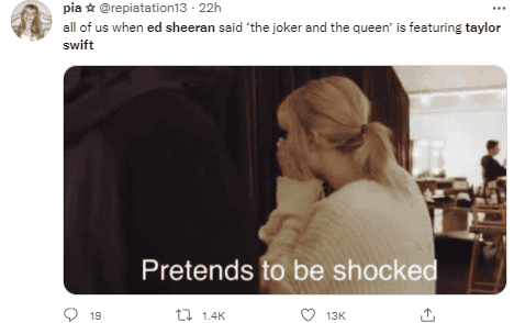 El interpréte de "Thinking out Loud", Ed Sheeran, ha confirmado después de su presentación en los Brit Awards, el lanzamiento de una nueva canción con Taylor Swift el próximo viernes. Sheeran hizo la revelación a la editorial digital LADbible con motivo de la gala anoche de los premios de música británicos.Previo a la revelación de detalles en la colaboración, los seguidores del músico ya anticipaban que sería una remezcla de "The Joker and the Queen", que salió en el cuarto álbum de estudio de Sheeran.Los dos músicos han colaborado en distintas ocasiones, entre ellas en 2012, cuando la cantante estadounidense lanzó su cuarto disco "Red", con la canción "Everything Has Changed" junto a Sheeran.Ed Sheeran, que ganó su séptimo Brit, como mejor compositor del año, lo que le empata con Arctic Monkeys, U2 y One Direcion, abrió anoche la ceremonia junto a Bring Me the Horizon. AF