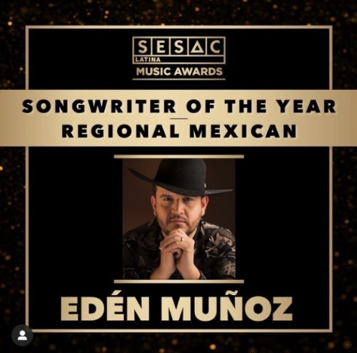 El cantautor Edén Muñoz fue reconocido como “Compositor del Año” durante la reciente entrega de los premios SESAC Latina, gracias al impacto que han causado temas como “A la antigüita” (Calibre 50), “Te volvería a elegir” (Calibre 50), “La casita” (Banda MS) y “Mi primera derrota”(Arrolladora Banda Limón).Edén, quien emprendió su carrera en solitario tras y una sólida trayectoria con la agrupación norteña Calibre 50, también recibió distinciones por los temas: “Tus desprecios” (El Fantasma/Pepe Aguilar) y “Vamos bien” (Calibre 50), logrando con ello posicionarse como el máximo ganador del certamen.“Muchas gracias primero que nada a mi familia, a mi hermano, a mi equipo de trabajo, a todos los que han creído en mí. Gracias a todos los que han hecho algo por mí sin habérselos pedido, de verdad muchas gracias. Ha sido una pandemia complicada, un año súper complicado personalmente hablando. Agridulce, artísticamente, porque ha sido el mejor año de mi vida. Me hace sentirme honrado este premio, me hace sentirme dichoso y, principalmente, el premio más grande es tener a todos ustedes como amigos que saben que los quiero. Gracias por confiar en mí, en mi música, en mis ideas, en mi terquedad. Gracias de verdad y esto va para ustedes”, indicó Edén Muñoz.En esta ceremonia el cantautor también tuvo una breve participación musical en la que interpretó los éxitos: “La casita”, “A la antigüita” y “Chale”, este último primer sencillo promocional de su faceta como solista. Esta canción se mantuvo durante tres semanas consecutivas en el primer lugar de popularidad en los Estados Unidos.Fundada en 1930 SESAC (Society of European Stage Authores and Composers), es la segunda organización más grande especializada en los derechos de autor en los Estados Unidos. SESAC tiene más de 30 mil compositores inscritos y un catálogo de más de un millón de composiciones.Edén Muñoz ha sido reconocido en dos ocasiones como el compositor del año por SESAC Latina, recibiendo también en siete ocasiones el “Sebastianas”, la presea que otorga la SACM (Sociedad de Autores y Compositores de México) a los autores de las canciones más destacadas del año. Asimismo, ha recibido múltiples nominaciones a Grammys y Latin Grammys como compositor y productor.También ha sido miembro activo de la Academia Nacional de Artes y Grabación de Estados Unidos, que lo ha reconocido como uno de los talentos más multifacéticos de los últimos tiempos. Sus letras y producciones musicales han sido grabadas grandes artistas como: Alejandro Fernández, Pepe Aguilar, Maluma, Carlos Rivera, Banda MS, Yuridia, entre otros muchos.Como intérprete, Edén fue líder del grupo Calibre 50, una agrupación que está catalogada como una de las más exitosas del género regional mexicano y que ha aparecido de manera constante en las listas de éxitos que emiten los medios y las plataformas especializadas como Billboard.Rodolfo Edén Muñoz Cantú, mejor conocido en el medio artístico como Edén Muñoz, es cantautor, productor y músico, nacido en la ciudad de Los Mochis, Ahome (en Sinaloa) el 25 de septiembre de 1990, siendo el menor de cuatro hermanos, del matrimonio de Isidora Cantú y Rodolfo Muñoz.MF