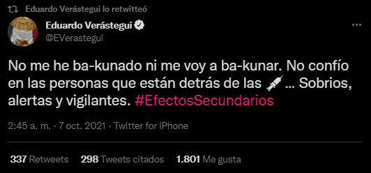De nuevo, el productor y actor Eduardo Verástegui está en medio de la polémica desde hace unos días, y es que el famoso hizo unas declaraciones ahora sobre la vacuna contra el COVID-19.Según Eduardo, no se ha vacunado contra el COVID-19 y no se vacunará, ya que desconfía de esta. “No me he ba-kunado ni me voy a ba-kunar”.“No confío en las personas que están detrás de las vacunas... sobrinos, alertas y vigilantes.”, advirtió Verástegui a través de Twitter. El comentario de Verástegui rápidamente se hizo viral, y recibió varios comentarios negativos, por desinformar a la gente sobre las vacunas contra el COVID-19. Incluso hubo quienes lo compararon con Paty Navidad.Hace apenas un mes, Verástegui fue duramente criticado luego de afirmar que el sismo que se registró el pasado 7 de septiembre en Acapulco, Oaxaca y CDMX, fue como consecuencia de que México despenalizara el aborto.AC