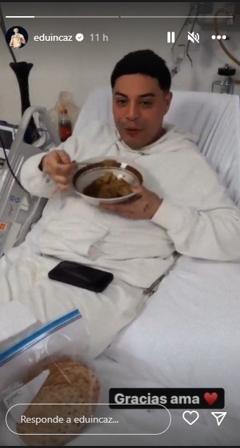Eduin Caz no se encuentra al cien de salud, pues el vocalista de Grupo Firme nuevamente puso en alerta a sus fans tras compartir un video en el que aparece en la cama de un hospital con suero y comiendo buñuelos que le mandó su mamá.Aunque Caz y su banda de regional mexicano han tenido un año lleno de éxitos, en cuanto a su estado de salud respecta no le ha ido del todo bien. Recordemos que desde marzo, tras ofrecer shows en el Foro Sol, terminó en el hospital.El intérprete de “El tóxico” padece de hernia hiatal desde hace años, la cual se complica cuando bebe mucho alcohol, vicio que el propio cantante ha intentado sacar de su vida sin mucho éxito, pues, por ejemplo, llevaba más de un mes sin tomar, pero a raíz del lanzamiento de nueva música volvió a las andadas, y ahora, luego de Navidad, apareció en una cama sin el mejor semblante.En el programa Hoy Día, informaron que la voz principal de Grupo Firme se la pasó en la cama de un hospital luego de que tuvo una recaída por el asma que padece desde 2021.A Eduin le detectaron esta enfermedad respiratoria desde el 2021, cuando incluso pensaron que se trataba de COVID, esto explicaría por qué en más de una ocasión ha aparecido con máscara de oxígeno antes de algunos conciertos.La noche del 24 de diciembre compartió fotos familiares deseando una Feliz Navidad. En una de ellas aparece acariciando la pancita de su esposa Daisy Anahy, quien recientemente compartió que se convertirá en madre por tercera ocasión.Eduin Caz alegró a sus fans tras postear un video en el que aparece cantando "Decide tú" con Julión Álvarez, por lo que cibernautas le pidieron que se armen más duetos con Álvarez. MS