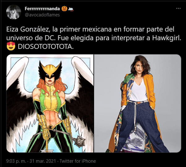 La consolidación que la mexicana Eiza González vive en Hollywood la ha llevado a ser considerada cada vez con más frecuencia en grandes producciones como “Baby: el aprendiz del crimen”, “Bloodshot”, y recientemente con “I care a lot” en Netflix y “Godzila vs. Kong”, que demuestras que perfiles como el de Eiza pueden salir del tradicional molde latino y realmente explorar personajes que no recurren al cliché.En diversos momentos han surgido rumores sobre cuáles son las películas a las que ha hecho casting, proyectos que Eiza González ha mantenido en secreto y revelado hasta poco tiempo antes de que el filme se anuncie oficialmente o tenga una fecha concreta de estreno.Progresivamente Eiza, que comenzó a forjar carrera con la telenovela juvenil “Lola, érase una vez”, se ha ganado el cariño de la audiencia que aplaude cada una de las proyecciones en las que Eiza participa y genera grandes expectativas cuando corren por los pasillos de las productoras y principalmente en redes sociales, sobre las posibilidades de que se integre a producciones más mediáticas como recientemente se ha dicho sobre el supuesto ingreso que tendrá al Universo Extendido de DC en la pantalla.La emoción por ver a Eiza en universos cinematográficos de gran peso ha dado paso a rumores a los que la actriz no ha desmentido ni confirmado, como sucede con el personaje de “Hawkgirl”, heroína de DC Comics, que se ha convertido en tendencia después de que se filtrara información que indicaría que Eiza sería la responsable de dar vida a esta mujer poderosa en la próxima película de “Shazam”.Aunque Eiza suele ser activa en redes sociales compartiendo sus proyectos y la amistad que ha forjado con el elenco con el que comparte créditos como Rosamund Pike, la actriz no ha publicado nada sobre este rumor para dar vida “Hawkgirl”, sin embargo, el público celebra la posibilidad de que Eiza sea la primera mujer mexicana en formar parte del canon oficial del Universo Extendido de DC en la pantalla grande.Esta no es la primera vez en que los fans anuncian la supuesta llegada de Eiza González al mundo de las heroínas, pues en años pasados en redes sociales también se esparcieron rumores sobre una supuesta prueba de vestuario y audición que habría hecho para interpretar a la mítica felina “Catwoman”, en la producción de “The Batman”, de Matt Reeves, sin embargo, esto jamás fue confirmado ni descartado por la actriz mexicana.Ante los tuits que ganaron popularidad sobre Eiza González y “Hawkgirl”, otros usuarios se han sumado a la conversación señalando que el rumor comenzó a tomar fuerza al ser una broma con motivo del “April Fools”, una celebración similar al Día de los Inocentes en Estados Unidos, además recalcando que los productores de la segunda entrega de “Shazam: Furia de Dioses” no han hecho anuncio oficial.En su cuenta de Twitter, la cadena @Cinemex compartió algunas fotografías de Eiza en su Instagram y añadió un par de representaciones gráficas de la supuesta heroína que la mexicana interpretaría, pero dejó en claro que solo se trata de una broma.“¿Quién se emocionó al leer que #EizaGonzález sería la primera mexicana en el universo cinematográfico de #DC interpretando a #Hawkgirl en la película #Shazam!? Ojalá esta broma se convierta en realidad y pronto sea algo oficial, ¿quién la quiere ver como una superheroína?”, compartió la cuenta certificada de Cinemex.También conocida como la “Chica halcón”, este personaje forma parte del universo de DC Comics y se le han atribuido otros nombres civiles como “Shiera Sanders Hall” o “Kendra Saunders” cuando está fuera de su característico traje con antifaz y sin sus enormes alas, una de sus principales virtuales que le brindan capacidades de vuelo, velocidad y fuerza.Dentro de los cómics, a “Hawkgirl” se le relaciona como una deidad o con orígenes divinos por sus ancestros. Sus primeras apariciones se remontan a principios de 1940-1941 y se la ha relacionado con “Flash”, con quien ha compartido diversas misiones en la "Liga de la Justicia" en diferentes volúmenes narrativos.AC