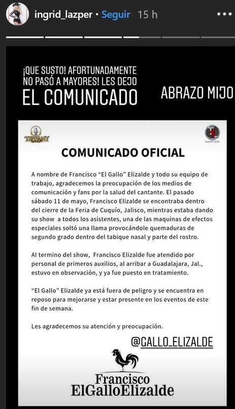 "El Gallo" Elizalde sufrió quemaduras de segundo grado dentro del tabique nasal y el rostro durante su pasada presentación en la Feria Cuquío, Jalisco.El cantante se encontraba en pleno show cuando una de las máquinas de efectos especiales soltó una llama justo en su rostro.De inmediato, el cantante fue atendido por personal de primeros auxilios y luego fue llevado a Guadalajara, donde estuvo en observación y posteriormente fue dado de alta.A través de un comunicado se informó que el intérprete ya fue dado de alta y se encuentra en tratamiento.JB