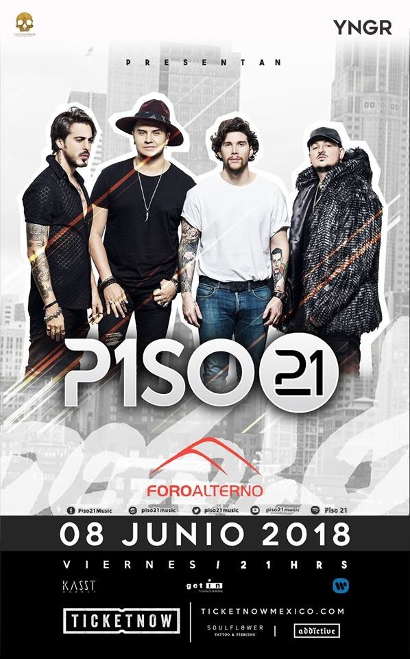 La agrupación colombiana 'Piso 21', llega a la Perla Tapatía para ponernos a bailar este 8 de junio en el Foro Alterno.Con una breve pero consistente trayectoria, el cuarteto ha logrado reconocimientos y nominaciones a nivel mundial, entre ellos: Latin Grammy, Premios Nuestra Tierra, Premios Los 40 Principales, MTV Millenials Awards y MTV Europa, además de posicionarse en los primeros lugares de los charts de pop y ritmos latinos.Juan David Castaño (Voz); Juan David Huertas (Guitarra líder); David Escobar (Voz y Guitarra rítmica) y Pablo Mejia Bermudez (Voz) han logrado cautivar a miles de seguidores para contagiarlos con su romanticismo y carisma con temas como ‘Déjala Que Vuelva’, ‘Suele Suceder’, ‘Quítate la Pena’ y ‘Delicia’.Boletos disponibles en taquilla del C3 Stage, Foro Alterno, Tiendas Soulflower y Ticketnow MexicoPrecios:GENERAL A - Preventa 1 $800 pesos (solo 200 boletos)GENERAL B - Preventa 1 $490 pesos (solo 500 boletos)GENERAL A - Preventa 2 $900 pesos (del 201 al 1000)GENERAL B - Preventa 2 $590 pesos (del 501 al 1500)VIP - $1,1000 (limitado a 200 boletos)