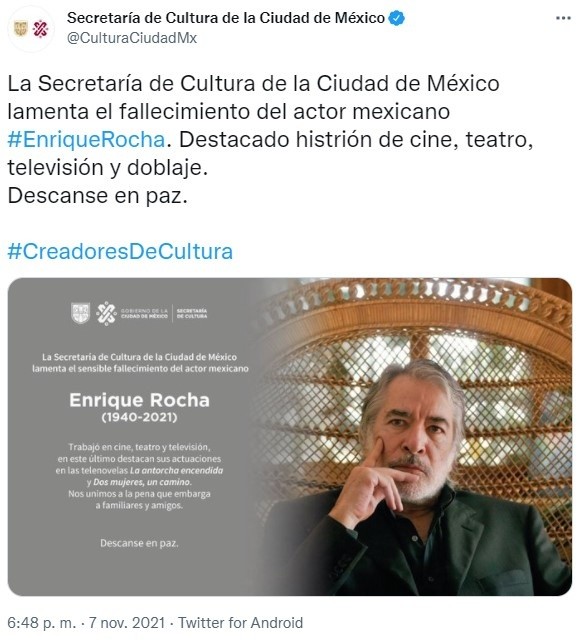 El actor Enrique Rocha falleció este domingo a la edad de 81 años, sin que hasta el momento se sepan los detalles del deceso, confirmó Óscar Espejel, empleado del actor.La Secretaría de Cultura de la Ciudad de México lamentó la muerte del histrión mexicano.Enrique Miguel Rocha Ruiz nació en Silao, Guanajuato el 5 de enero de 1940 y su carrera destacó sobre todo al dar vida a villanos en la televisión. También se desempeñó en el teatro.Se le recuerda por sus papeles en telenovelas como Pasoón y Poder, Mundo de Juguete, Yo compro esa mujer, Dos mujeres, un camino, El privilegio de amar, Una familia con suerte, Serafín, entre otras.IM