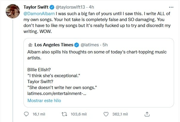 En una entrevista con Los Ángeles Times, el músico Damon Albarn externó su opinión sobre algunos artistas que en la actualidad encabezan las listas de popularidad, entre ellos Billie Eilish, de quien dijo "es excepcional", pero cuando le preguntaron sobre Taylor Swift respondió "Ella no escribe sus propias canciones".El tema se volvió viral al grado de que ha sido la propia Taylor Swift la que ha contestado a través de su cuenta de Twitter las declaraciones de Damon."Yo era una gran fan tuya hasta que vi esto. Yo he escrito todas mis canciones, tu opinión es completamente falsa y muy dañina. No te tienen que gustar mis canciones, pero es realmente jodido que desacredites mi escritura. Wow".Hasta la tarde de este lunes, la publicación de Taylor tiene alrededor de 50 mil retweets y más de 280 mil Likes.El músico británico es creador de Gorillaz, y también fue parte de la banda Blur. Tiene actualmente 53 años.Taylor es una cantautora estadounidense que ha arrasado con innumerables premiaciones. Entre sus discos se encuentran "Evermore", "Folklore", "Lover", "Reputation", entre otros. La artista también ha incursionado en el mundo de la moda y ha expandido su imperio en distintas ramas a sus 32 años.JM