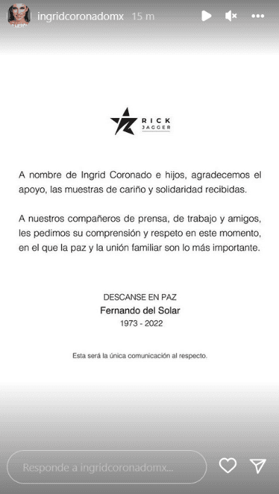 Luego de las múltiples críticas que ha recibido en redes sociales, la conductora Ingrid Coronado rompió el silencio a un día de que muriera su ex esposo y padre de dos hijos, Fernando del Solar.Fue a través de su cuenta de Instagram, que Ingrid Coronado compartió un comunicado en el que agradeció las muestras de cariño de familiares y amigos, pero también pidió respeto a la prensa, pues es un "momento en el que la paz y la unión familiar son lo más importante"."A nombre de Ingrid Coronado e hijos, agradecemos el apoyo, las muestras de cariño y solidaridad recibidas. A nuestros compañeros de prensa, de trabajo y amigos, les pedimos su comprensión y respeto en este momento", fue parte del comunicado que compartió a través de historias en Instagram.La ex conductora de TV Azteca, quien estuvo casada con Fernando del Solar del 2012 al 2015, ha sido fuertemente criticada por usuarios de redes sociales, quienes recordaron que la separación de ambos ocurrió mientras el estaba enfermo de cáncer.Incluso, la han comparado con Karla Panini, al considerarlas como las "artistas más odiadas" de México.Cabe recordar que Ingrid Coronado y Fernando del Solar tienen dos hijos, Luciano y Paolo, de 14 y 11 años, respectivamente.gc