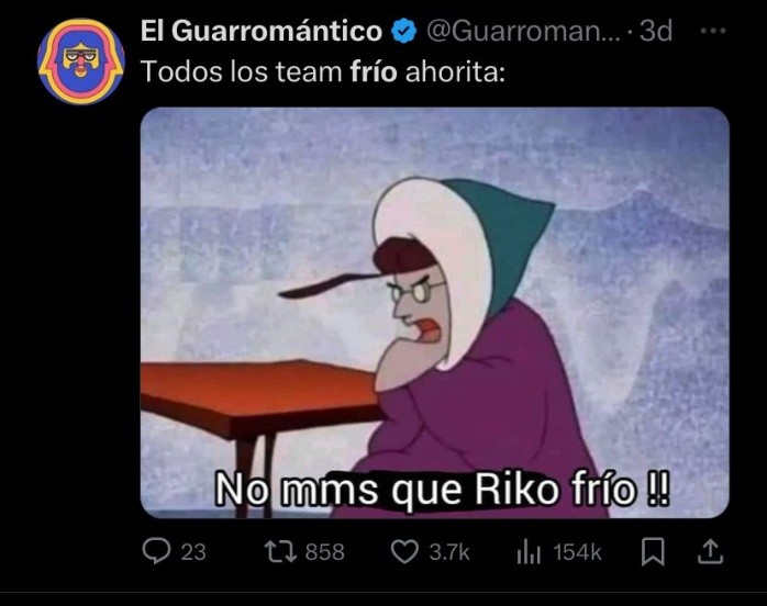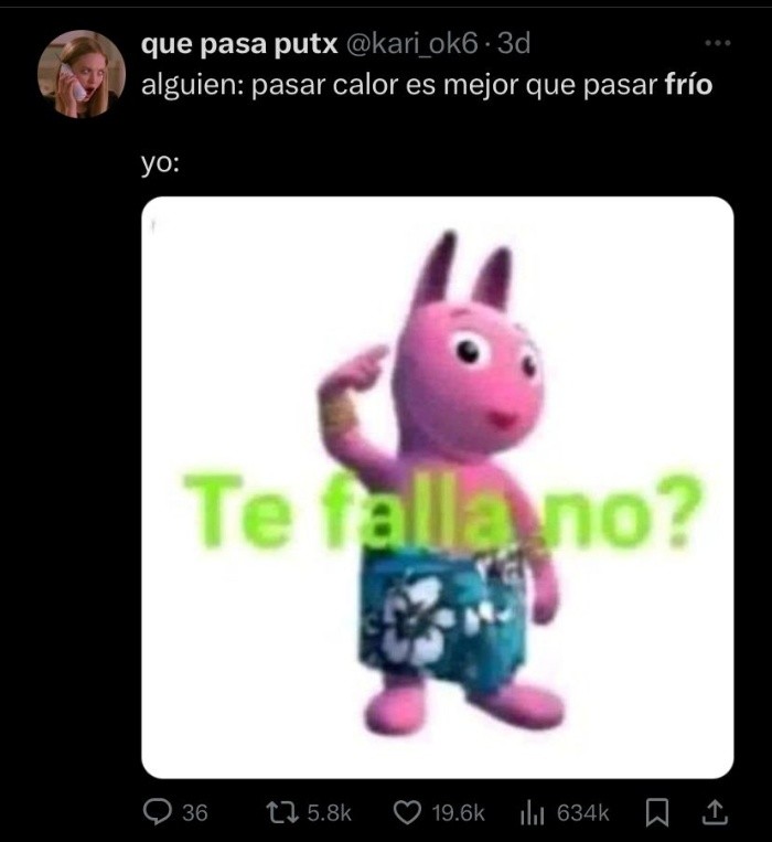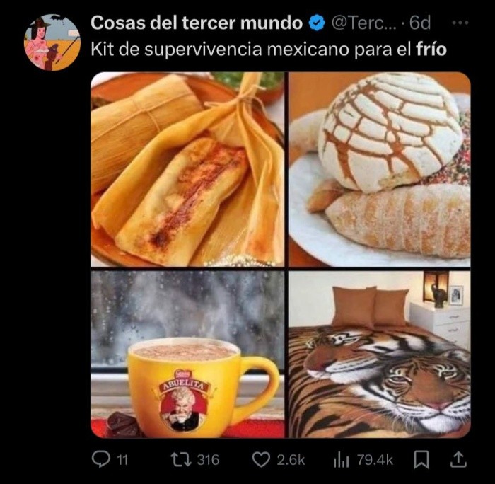 El frente frío número 16 ha comenzado y con el llegó una lluvia de memes, pues a través de redes sociales se han desatado memes de todo tipo con este clima más frío. Pues según el Servicio de Meteorología Nacional existe una gran cantidad de zonas afectadas por el frío, sin embargo, los estados de Veracruz, Oaxaca, Campeche y Yucatán serán unos de los lugares del país que se enfrentarán a la niebla y chubascos.TE PUEDE INTERESAR: Estas son las temperaturas más bajas que se han registrado en Guadalajara La mayor parte de los usuarios por medio de la red social X, anteriormente Twitter comparten una serie de memes divertidos por las bajas temperaturas, pues existe un cuestionamiento entre los usuarios debido a que no soportan el clima helado y consideran que a comparación de otros países la temperatura no es tan baja y aun así experimentan frío en estos días.Es por eso que existen memes como: Con estas temperaturas heladas la mayoría de la población suele sacar el cobertor del tigre, que nunca falta en los hogares mexicanos, además el delicioso chocolate abuelita, es por eso que lo llaman "el kit de supervivencia mexicana". TAMBIÉN LEE: Se espera fría noche en Guadalajara; conoce a cuántos grados estaremosEn redes sociales se ve la notable división del team frío y el team calor, pues existe una discusión que parece eterna sobre si la temporada del frío es mejor que la del calor, es por eso que los usuarios suelen hacer memes de este tipo. Por otro lado la Comisión Nacional del Agua (Conagua) informa que existirá una gran cantidad de frentes fríos que culminarán hasta febrero del año entrante. Así que prepárate y saca tu cobertor de tigre para esta temporada de invierno.Mantente informado en nuestro canal de difusión AQUÍ. SR