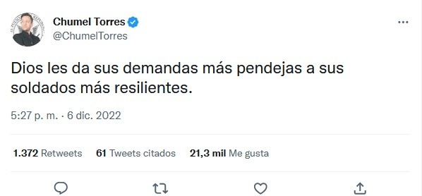 Chumel Torres respondió con la ironía que le caracteriza a la cantante Gloria Trevi, quien dijo que emprenderá acciones legales en su contra y otros comunicadores por los daños que le han ocasionado al hablar mal de ella. En mayo pasado, el youtuber compartió en sus redes sociales una imagen en la que aseguraba que "Gloria Trevi no canta chido, pero TRATA".Por tal motivo, la solista levantó una denuncia en contra del comediante por daño moral. Ante este anunció de demanda, Chumel volvió a responder de manera ácida, en su cuenta de Twitter: "Dios les da sus demandas más p*ndejas a sus soldados más resilientes".Los comentarios a favor y en contra del influencer no se hicieron esperar: "Tus chistes están contados", "Con todo mi Chumy, la banda contigo" y "Espero estés ahorrando para cuando pierdas la demanda".vll