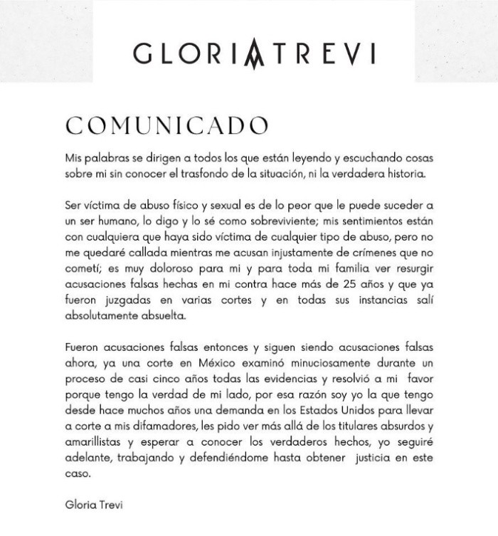 En un comunicado publicado a través de su cuenta de Instagram, la cantante mexicana Gloria Trevi ha salido al paso de la información que, hace unos días, la vinculó con denuncias por abuso en el vecino país del norte, acusaciones que –dijo en el escrito– “fueron falsas entonces y son falsas ahora”, a lo que agrega que se dirige a quienes se enteran de este tipo de declaraciones “sin conocer el trasfondo de la situación”.En el documento citado, la intérprete de ‘Doktor Psiquiatra’ refiere enfática que “ser víctima de abuso físico y sexual es de lo peor que le puede pasar a cualquier ser humano”, algo que sabe “como sobreviviente” y, con base en ello, decide no quedarse callada ante las acusaciones que recibe “por crímenes que no cometí”, situación sumamente dolorosa para ella y su familia.Asimismo, aclara Gloria Trevi que lo más doloroso es “ver resurgir” acusaciones que se le hicieron “hace 25 años” y que ya fueron juzgadas “en varias cortes y en todas sus instancias salí absolutamente absuelta”.La resolución en su favor tomó cinco años a los tribunales mexicanos, lo que –asegura la cantante– se debe a que “tengo la verdad de mi lado”, y enfatizó que es ella la que tiene una demanda en los Estados Unidos “en contra de mis difamadores”; por esto, la Trevi solicitó a quien lea el comunicado que “vea más allá de los titulares absurdos y amarillistas”, así como tener paciencia para “conocer los verdaderos hechos”.Así, finalmente, declaró que “seguiré adelante, trabajando y defendiéndome” para de esa forma “obtener justicia en este caso”.