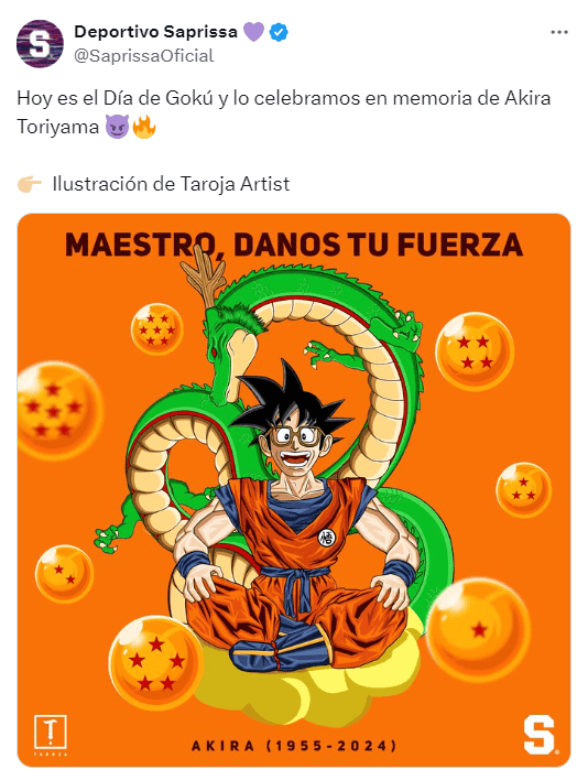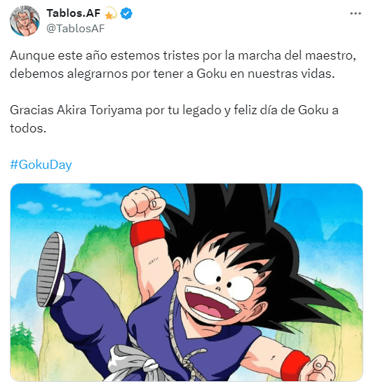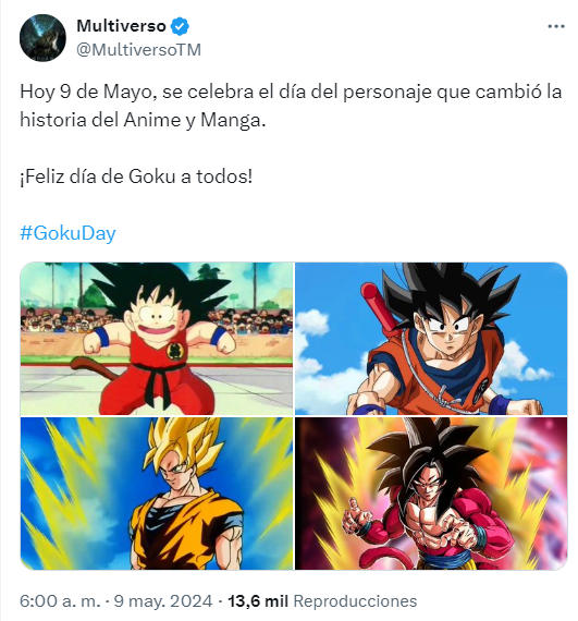 Este día jueves 9 de mayo es oficialmente reconocido como el "Día de Goku" (Goku Day en inglés).En el año que está marcado por la muerte de su creador, Akira Toriyama, el pasado 1 de marzo, el personaje más popular del anime y el manga es festejado por millones de seguidores en el mundo. La festividad nació como idea de los fans de Japón, donde existe una práctica derivada de la lectura del número del día y mes, a la que se le asocia algo relacionado con el juego de palabras que se forman. En el caso del día del protagonista de la serie Dragon Ball, surgió como la lectura del 5/9 (9 de mayo) que en japonés se traduce como "Go-Ku", por lo que la fecha es especial para quienes decidieron conmemorar al personaje este día.Y en el año 2015, la Asociación de Aniversarios de Japón declaró oficialmente el 9 de mayo como el "Día oficial de Goku".La iniciativa fue impulsada por Toei Animation, la compañía que distribuye el anime derivado del manga, así como las películas. En su primera edición se celebraban los 30 años de la franquicia, así como el estreno de la película "Dragon Ball Z: La Resurrección de Freezer".La fecha no sólo se conmemora en Japón. Fanáticos de todo el planeta comparten memes en redes sociales, videos, y en algunas televisoras se realizan maratones con la emisión de capítulos de las animaciones Dragon Ball, Dragon Ball Z y Dragon Ball Super, o bien, de las películas.*Mantente al día con las noticias, únete a nuestro canal de WhatsAppOF
