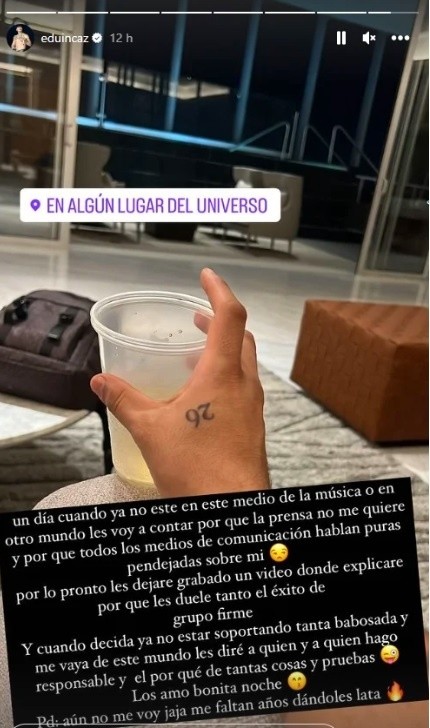 El pasado sábado 15 de octubre, Saúl "Canelo" Álvarez y Grupo Firme supuestamente tuvieron una discusión en plena fiesta de XV años de la hija del boxeador, esto de acuerdo con información de la influencer "Chamonic", quien al parecer ha recibido varias amenazas.Tal parece que a Eduin Caz, vocalista del grupo regional, no le agradó mucho esta información por lo que a través de sus redes sociales mandó un mensaje contra los medios de comunicación, luego de que se especulara que tuvo una discusión con el "Canelo" el pasado 15 de octubre. La influencer "Chamonic" aseguró que existía un video del momento en que el "Canelo", ya con unas copitas demás, corrió a Firme de la pachanga, además que tanto Eduin como Carin de León, otro de los artistas que se presentó, estaban alcoholizados.Luego de las declaraciones por parte de la influencer, la información llegó a varios medios por lo que Eduin Caz respondió sobre las especulaciones a través de cuenta de Instagram en donde compartió una fotografía en la que se ve su mano y un vaso con una bebida."Un día cuando ya no esté en este medio de la música o en otro mundo les voy a contar porqué la prensa no me quiere", sentenció y agregó "Todos los medios de comunicación hablan puras pendejad... sobre mí".El intérprete de "Ya supérame" aseguró que dejará un video grabado en donde explicará los motivos de por qué algunas personas "sienten celos" del éxito de Grupo Firme, además habló sobre su muerte."Y cuando decida ya no estar soportando tanta babosada y me vaya de este mundo les diré a quién y a quién hago responsable y el porqué de tantas cosas y pruebas".Pese a que retomó el tema de su fallecimiento aclaró que: "Aún no me voy, ja ja, me faltan años dándoles lata".Hasta el momento ninguno de los famosos ha aclarado explícitamente la situación.MF