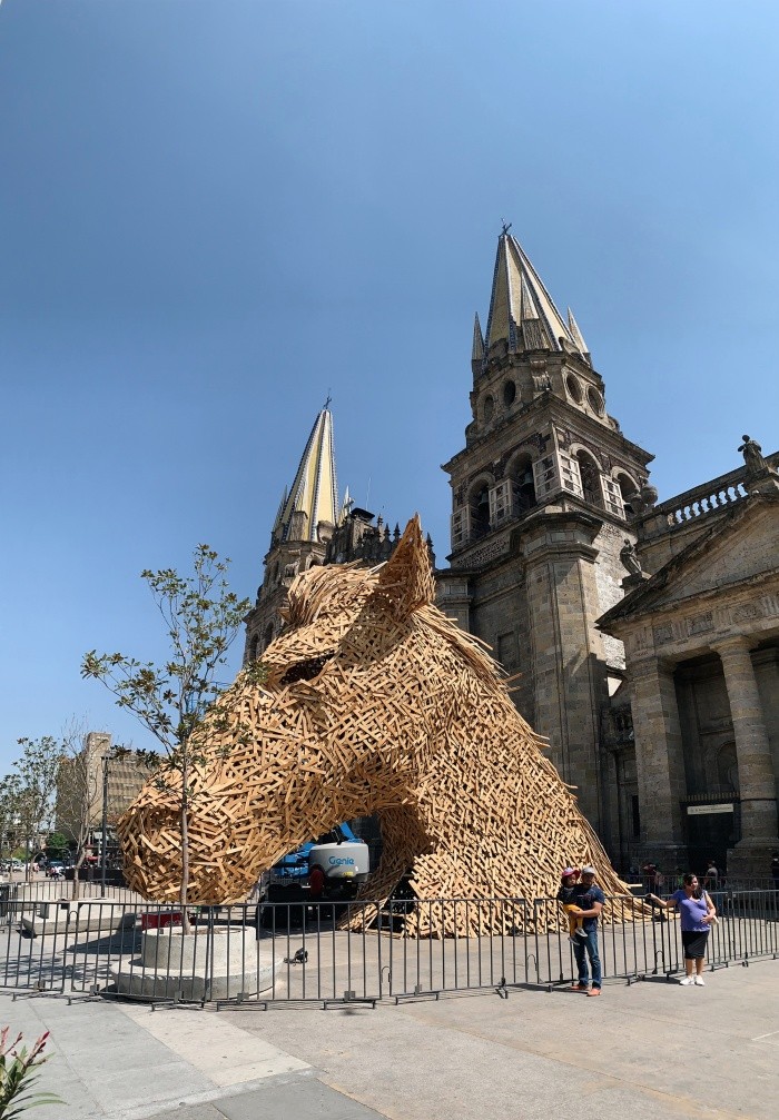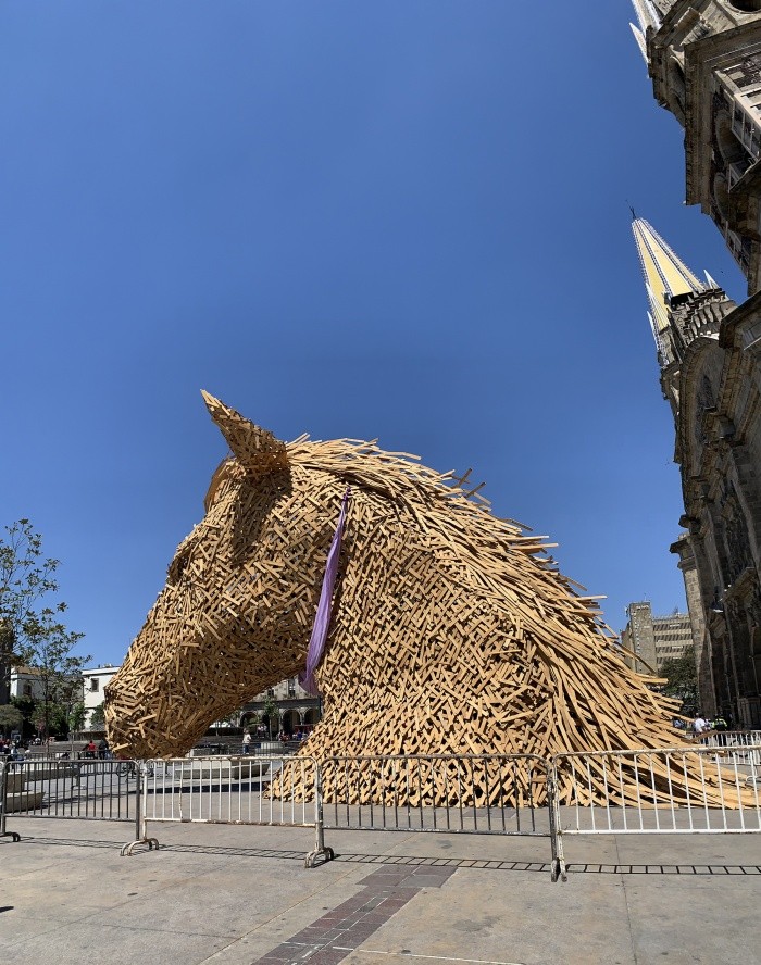 Como parte del festival GDLUZ -llevado a cabo del 2 al 5 de marzo- que celebró el 480 aniversario de Guadalajara, se instaló afuera de la Catedral de Guadalajara un busto de 14 metros un caballo hecho con aproximadamente 10 mil tablas de madera, en honor al recientemente fallecido cantante Vicente Fernández, oriundo de la Perla Tapatía.El espectáculo constó de 30 atracciones como homenaje al aniversario de la ciudad, el cual a pesar de haber ocurrido el 14 de febrero, se vio retrasado debido a la pandemia.Sin embargo, la llamativa escultura en honor al “Charro de Huentitán” seguirá adornando al Centro Histórico de la Ciudad durante todo el mes de marzo, según detalló Pablo Lemus Navarro, alcalde de Guadalajara."Respecto al tributo a don Vicente Fernández con esta hermosísima obra de arte, este caballo, que por cierto llegamos a un acuerdo para que una vez pasado el festival este caballo se pueda tener un mes más aquí para fomentar los atractivos en el Centro Histórico y que la gente pueda venir y tomarse una selfie", explicó Pablo Lemus.Durante la marcha ocurrida en Guadalajara el pasado 8 de marzo debido al Día Internacional de la Mujer, se le colocó a la escultura un paliacate color morado, símbolo del movimiento feminista.MR