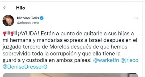 Luego de que el cineasta tapatío Guillermo del Toro solicitara mediante un tuit ayuda a Marcelo Ebrard, titular de la Secretaría de Relaciones Exteriores (SRE) para apoyar a dos niñas que pretendían llevarse a Israel sin consentimiento de su madre, el funcionario solicitó que se revisara el caso y ellas volvieron a casa."Ya boletinado en el Aeropuerto CDMX, no permitir el abuso. Es la instrucción que tenemos", respondió Ebrard.Ayer, Marcelo Ebrard informó que las menores Gal y Maya, sobrinas de Nicolás Celis, productor de la película Roma, ya se encuentran con su madre Carolina Inés Medina. “Gal y Maya ya están en este momento con su madre, Carolina Inés Medina. Agradezco el apoyo de las partes así como de sus representaciones legales”, escribió el canciller en Twitter."¿Alguien puede ayudar con esto?", fue el tuit que escribió el cineasta Guillermo del Toro, donde añadió la cuenta de Marcelo Ebrard y de la SRE.Lo anterior lo hizo en apoyo al productor Nicolás Celis ("ROMA" y "Noche de fuego") quien denunció que a sus sobrinas se las querían llevar, por la fuerza: "Están a punto de quitarle a sus hijos a mi hermana y mandarlas express a Israel después de que hemos sobrevivido toda la corrupción y que ella tiene la guardia y custodia en ambos países", escribió.