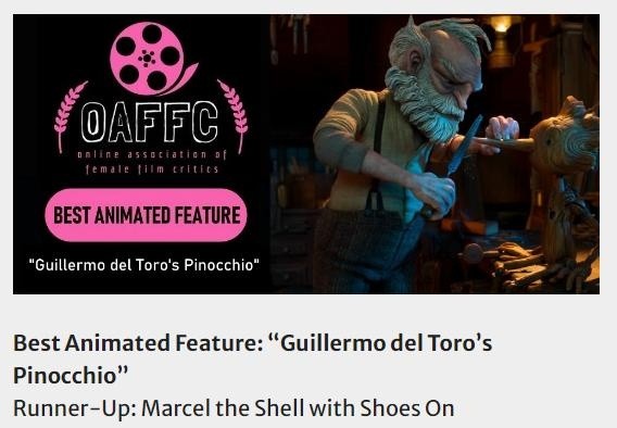 "Pinocho", el filme del mexicano Guillermo del Toro, fue reconocido como mejor película de animación por los Online Association of Female Film Critics 2022 Awards.La Asociación Online de Mujeres Críticas de Cine anunció este martes en su página web los filmes ganadores de este año, entre los que se encuentra la película de inspirada en el cuento original de Carlo Collodi.El premio se suma a una larga lista de reconocimientos que el proyecto de Del Toro ha recibido de parte de asociaciones de críticos de cine de Los Ángeles, Boston, Dallas, entre otros.Además, "Pinocho" cuenta con dos nominaciones a los Globos de Oro 2023, tres nominaciones a los Critics Choice Awards, y forma parte de la lista previa a las nominaciones de del Óscar.No obstante, la película más premiada de los Online Association of Female Film Critics 2022 Awards fue "Everything Everywhere All at Once", que recibió ocho menciones y que se ha posicionado como una de las películas más prometedoras de la temporada de premios.La película ganó en las categorías a mejor película, mejor director, por el trabajo de Dan Kwan y Daniel Scheinert, mejor actriz principal, por la actuación de Michelle Yeoh, así como mejor actriz y actor de reparto respectivamente, mejor guión original, mejor edición y diseño de vestuario.Asimismo, "The Banshees of Inisherin" de Martin McDonagh, otra de las grandes promesas de la temporada, ganó en dos categorías: a mejor actor, por la interpretación de Colin Farrell y mejor guion original en empate con "Everything Everywhere All at Once".Finalmente, el filme de Sarah Polley, "Women Talking", recibió los títulos de mejor guion adaptado, mejor reparto y el premio Rosie, "reconocimiento que celebra la película que mejor promueve a las mujeres, sus voces y la experiencia femenina a través del cine", explicó la asociación.