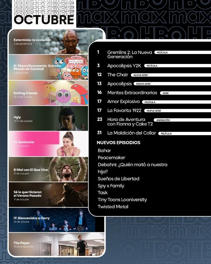 HBO Max continúa este octubre con sus mejores estrenos para que disfrutes tus series y películas favoritas desde la comodidad de tu casa, pues del 13 al 19 de este mes podrás encontrar disponible en el gran catálogo de la plataforma desde nuevas series futuristas hasta cintas de terror que no te dejarán dormir. El 17 de octubre llega a HBO Max “La Favorita 1922”, Producida por Mediaset España en colaboración con Bambú Producciones, la serie narra la vida de Elena de Valmonte, una marquesa culta y apasionada por la gastronomía que vive atrapada en un matrimonio sin amor.Tras un acontecimiento trágico junto a su fiel doncella Cecilia, ambas se ven forzadas a escapar a Madrid, donde deciden empezar de nuevo, allí alquilan un antiguo local perteneciente a un joven apuesto y emprenden un ambicioso proyecto: abrir un restaurante que pronto se convertirá en uno de los más prestigiosos de la capital.Por otro lado el mismo dia se estrena “Amor explosivo” una película donde Marvin Gable, es un agente inmobiliario que trabaja en los tranquilos suburbios de Milwaukee, una zona repleta de carteles de “Se Vende”. Su rutina da un giro inesperado cuando recibe un misterioso sobre carmesí enviado por Rose, una antigua cómplice a la que creía muerta… y que no regresa precisamente de buen humor.De pronto, Marvin se ve arrastrado nuevamente a un mundo violento y despiadado de asesinos a sueldo, donde las traiciones son moneda corriente y las casas abiertas se transforman en campos de batalla mortales.13 de octubre: Apocalipsis (nueva serie).16 de octubre: Mentes extraordinarias (serie).17 de octubre: Amor explosivo (película).17 de octubre: La Favorita 1922 (nueva serie).17 de octubre: Sé lo que hicieron el verano pasado.NA