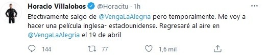 Vaya susto el que se llevaron los seguidores de Horacio Villalobos esta mañana de martes, cuando en su cuenta de Twitter, el conductor anunció su salida del programa "Venga la Alegría".Sin dar detalles, Villalobos sugirió a sus fans que le prendieran al matutino de TV Azteca porque hablaría de su salida del programa.Minutos más tarde, en esta misma red social, Horacio detalló que la salida sería temporal y que volvería en abril después de participar en una película inglesa-estadounidense. Villalobos se integró a "Venga la Alegría" en mayo de 2020."Efectivamente salgo de@VengaLaAlegria pero temporalmente. Me voy a hacer una película inglesa- estadounidense. Regresaré al aire en @VengaLaAlegria el 19 de abril", se lee.Los seguidores del conductor le desearon lo mejor en esta experiencia actoral fuera del teatro, y reconocieron que lo extrañarían mucho en el matutino, donde hace mancuerna con Anette Cuburu, Cynthia Rodríguez, Laura G, Capi Pérez, Patricio Borghetti, Roger González y Ricardo Cásares.Hace unos días, Horacio Villalobos se convirtió en tendencia en las redes sociales luego de que la conductora Natalia Téllez lo acusara por tener conductas transfóbicas, en específico con Alejandra Bogue, con quien Villalobos ha tenido problemas en el pasado."¿Transfóbico yo? ¡Nunca! Si algo he hecho es defender la diversidad. Y he luchado en contra de la homofobia y la transfobia en las empresas en las que he laborado", respondió Horacio. jb