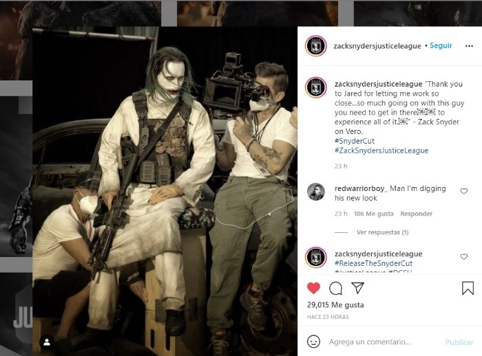 Zack Snyder reveló una nueva imagen de “Joker”, interpretado por Jared Leto, que forma parte de su versión de “Liga de la Justicia”.Fue a través de la plataforma Vero donde Snyder reveló la instantánea donde se muestra a Leto detrás de cámaras para las grabaciones extra que realizaron para la nueva versión de la película.Además, Zack Snyder dedicó un breve mensaje a Jared y agradeció su trabajo para este filme. “Gracias Jared por dejarme trabajar tan cerca… tantas cosas están pasando con este tipo, que tienes que meterte ahí para experimentarlo todo”, escribió Snyder.Estos últimos días, Snyder y el equipo de HBO Max han compartido pósters oficiales de cada uno de los personajes de “Liga de la Justicia”, tales como “Mujer Maravilla”, “Flash”, “Aquaman”, “Cyborg”, “Superman” y “Batman”.Aparentemente, y luego de que se filtraran algunas escenas de “Liga de la Justicia” en redes sociales por un descuido de HBO Max, el “Joker” aparecerá en una pesadilla de “Batman” donde muestra un futuro postapocalíptico. El regreso de Jared Leto como “Joker” se dio en el tráiler oficial de “Liga de la Justicia”.“Vivimos en una sociedad donde el honor es un recuerdo lejano. No es así, ¿´Batman´?”, dijo “Joker”.La versión de “Liga de la Justicia” de Zack Snyder se estrenará el próximo 18 de marzo a través de la plataforma HBO Max en Estados Unidos, para México y el resto del mundo se podrá comprar en Video on Demand de distintas tiendas virtuales. AC