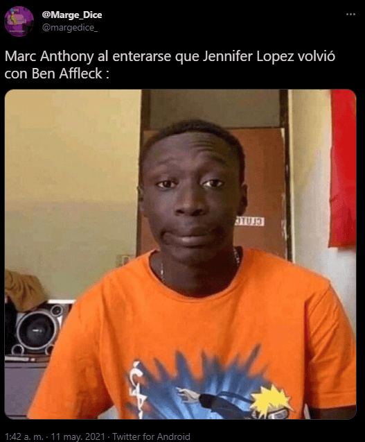 Tras el anuncio de la supuesta reconciliación entre Jennifer López (JLo) y Ben Affleck, algunos usuarios en redes sociales compartieron memes y reacciones sobre la pareja. Cabe recordar que la cantante acaba de terminar su relación con el beisbolista Alex Rodríguez. De acuerdo con E! News, Affleck y JLo se tomaron unas vacaciones de una semana en Yellowstone Club en Montana luego de haber asistido, por separado, a un concierto de VAX Live.“Ben Affleck y JLo se encuentran después de 17 años”, “Si Ben Affleck regreso con JLo está otra pareja puede regresar también Manos palma contra palmaPalo de corazones” y “Si Ben Affleck ha vuelto con JLo, ya va siendo hora de que vuelvan ellos dos”, son algunos de los comentarios en Twitter.Recientemente se dio a conocer que Jennifer López y Alex Rodríguez terminaron su relación luego de cuatro años juntos y ya un compromiso en puerta.Affleck y López han tenido contacto desde hace tiempo, luego de haber terminado su relación en 2004.La pareja se conoció en 2002 durante la filmación de “Gigli”.AC