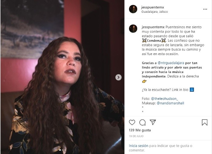 La cantante y compositora Jess Puente estrenó recientemente su sencillo “Condena”, un tema muy complejo y difícil debido a la situación por la que pasó.De acuerdo con Puente, el tema emprende un viaje de autoconocimiento, durante su periodo de ansiedad, donde “parecía no haber salida”.“´Condena´ es una canción que habla de desamor pero, a pesar de que la tenía lista, estaba esperando el momento para lanzarla (...) Quería darle su lugar”, dijo Puente a INFORMADOR.MX.La mexicana detalló que el tema fue “una manera de sacar la ansiedad y el estrés” de su cuerpo. “No sólo era la ruptura (que vivió), eran muchas cosas que traía, que no me estaba dando cuenta y, bueno, la ruptura vino a intensificar todos los síntomas”. “No todo es feliz. No puedes estar todo el tiempo saltando todo el día (...) Hay un entendimiento muy grande de conocerte, de saber quién eres y, entonces, así puedes entender por lo que estás pasando”, agregó.Con “Condena”, Jess Puente espera que los fans puedan tener un tema de acompañamiento y catarsis. “Que les puede servir para entender límites”.“Como un surgimiento del amor propio, no como egoísmo, sino que tengo que ver por mí”, agregó.Sobre sus futuros proyectos, Puente descartó que el tema se trate de un adelanto de su próximo álbum, pues se siente cómoda lanzando sencillos. No obstante, adelantó que pronto estará lanzando el videoclip de “Condena” por las plataformas de streaming.“Ya está en los últimos detallitos”, aseguró.Jess Puente es una artista independiente de origen mexicano. Ha participado en festivales nacionales e internacionales. Su género es una combinación entre pop, jazz y soul, donde explora la sensibilidad femenina y propone el empoderamiento de la mujer a través de sentimientos y acciones.Puente colaboró desde pequeña con The Walt Disney Company en algunos doblajes de temas de películas como “Juego de Gemelas”.“Me despegué de ese mundo porque es otra rama a la que hay que darle todo el espacio y la atención. Pero decidí dedicarme a componer”. Jess no descartó volver a trabajar con Disney para proyectos musicales.Otra de las colaboraciones musicales en las que participó Jess fue en la película “El tamaño sí importa”, con “Obsesión”, mismo que la impulsó a lanzar más música.AC