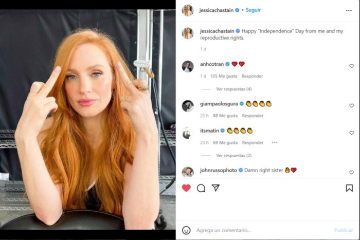 La reciente ganadora del Oscar, Jessica Chastain ha causado revuelo en redes sociales luego de que la actriz, quien fue galardonada en la pasada ceremonia de la Academia por su rol en “The eyes of Tammy Faye”, al compartir una fotografía en la que se expresa estar “celebrando” el Día de la Independencia de Estados Unidos y en la que aparece levantando sus ambos dedos medios a forma de protesta ante la decisión que tomó la Corte Suprema de Estados Unidos al eliminar el fallo conocido popularmente como “Roe vs. Wade”, que brindaba el derecho constitucional al aborto y que ahora queda anulado en diversas localidades de Estados Unidos.La publicación de Chastain ha generado discusión entre los internautas, pues su fotografía compartida en su cuenta oficial en Twitter, ha sido tomada por algunos como ofensiva o innecesaria ante el gesto de sarcasmo que la actriz expresó, pues indicó “Feliz día de la ‘independencia’ de mi parte y de mis derechos reproductivos”, haciendo referencia a la anulación de “Roe vs. Wade” que ha generado protestas al considerar que es un retroceso hacia los derechos de las mujeres.Con más de medio millón de reacciones a su fotografía, fans de la actriz han aplaudido la postura de Jessica Chastain, en tanto que otros indican que este tipo de expresiones no son las adecuadas para entablar el diálogo y solo se generan más divisiones en las opiniones para trabajar en la situación.Jessica Chastain no es la única figura pública que en el marco de las actividades por el Día de la Independencia celebrado este 4 de julio, pues la cantante Katy Perry también se expresó en Twitter con una publicación en la que indicó “’Baby, eres un fuego artificial es un 10’, pero las mujeres en U tienen menos derechos que una bengala real”, haciendo referencia a uno de sus populares éxitos como “Firework”.En sus redes sociales, la Reina del Pop, Madonna, también se manifestó mediante un breve video en el que muestra cómo una mujer es arrestada y esposada por policías, mostrando a la par fragmentos del Himno Nacional de Estados Unidos cantados por Madonna: “Así es cómo se ve la vida si eres una mujer en Estados Unidos... No es el Día de la Independencia para nosotros. ¡Comencemos una revolución!”.AC