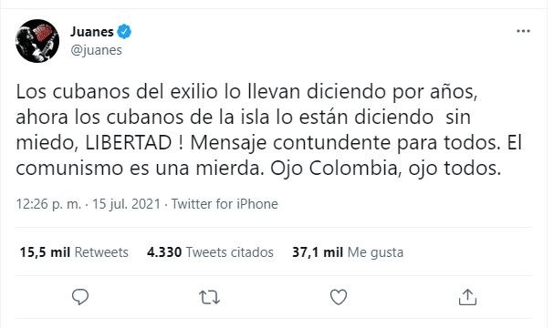 El cantante colombiano Juanes se volvió tendencia en redes sociales luego de hacer pública su opinión acerca de la situación que vive Cuba actualmente.Fue a través de Twitter donde el intérprete de "La camisa negra" dijo estar a favor del movimiento social comenzado el pasado 11 de julio por los cubanos de distintas ciudades que se levantaron en contra del Gobierno actual, bajo las premisas de "libertad" y "alto a la dictadura"."Los cubanos del exilio lo llevan diciendo por años, ahora los cubanos de la isla lo están diciendo sin miedo, LIBERTAD ! Mensaje contundente para todos", escribió Juanes.Además, aprovechó para enviar un mensaje político para sus compatriotas a partir de una crítica al sistema comunista, que actualmente rige en la isla y lo ha hecho desde la Revolución Cubana, que terminó en 1959."El comunismo es una mierda. Ojo Colombia, ojo todos", dijo haciendo un llamado a los ciudadanos para que estén atentos y eviten este sistema político.Su mensaje, que ha generado más de 35 mil interacciones también dividió opiniones entre los usuarios de esta red social, pues por un lado están quienes le aplauden el apoyo hacia Cuba, mientras que otros le reprochan que no se haya pronunciado de la misma manera por el pueblo colombiano, cuando recientemente también se manifestó contra el gobierno en varias protestas sociales.MB