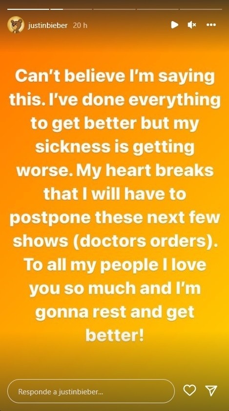 El "Justice World Tour" de Justin Bieber tendrá que ser pospuesto por algunos días debido a que Justin Bieber presentó problemas de salud, según dio a conocer a través de sus redes sociales.Luego de sus presentaciones en México, Justin Bieber recorrerá las fechas en Toronto y Washington D.C. por la enfermedad que "está empeorando", sin dar detalles de cuál se trata. No obstante, el cantante canadiense prometió descansar."No puedo creer que esté diciendo esto. He hecho todo lo posible para mejorar, pero mi enfermedad está empeorando. Mi corazón se rompe porque tendré que posponer estos próximos shows (órdenes médicas). A toda mi gente los quiero mucho y voy a descansar y mejorar", escribió Bieber.El pasado 28 de mayo, Justin Bieber se presentó en el Estadio 3 de marzo frente a 20 mil fans, después de sus presentaciones en Monterrey y Ciudad de México.PC