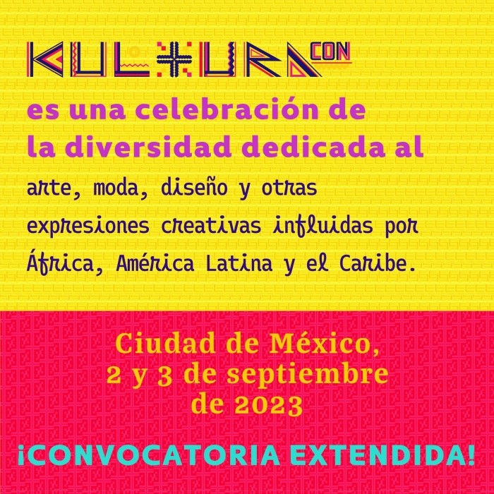 El 2 y 3 de septiembre, CDMX albergará al festival KULTURA CON, un espacio para artistas, diseñadores y creadores de poblaciones afrolatinas, afrocaribeñas, culturas originarias y LGBTTTIQ+ ubicadas en México, aunque no se cierra a la participación de ninguna persona o colectivo, siempre y cuando su propuesta guarde una relación con estas influencias, abundantes en el mundo entero.La primera edición del festival KULTURA CON 2023 llega a la Ciudad de México a manera de festival dedicado a las vibrantes influencias y conexiones entre África, América Latina y el Caribe los días 2 y 3 de septiembre de 2023 para ofrecer dos días de música, artes, comida, activismo y mucho baile con sabor afrolatino.El festival contará con las siguientes categorías; para los interesados en participar, la convocatoria se extendió hasta el próximo 30 de julio.El evento será curado por un jurado compuesto por el artista multidisciplinario Coréon Dú, la escritora Jumko Ogata, el cineasta André Lô Sánchez, la cofundadora de Colectivo Ääts Nancy Vázquez, la artista drag y visual Astra Lem y el colectivo femiinista Afrocaracolas.Kultura Con contó con ediciones anteriores en línea que proyectaron proyectos audiovisuales de creadores de más de 23 países. Su primera edición en vivo en la Ciudad de México espera resaltar la vitalidad y el dinamismo de la escena cultural de la ciudad, junto con los mejores talentos y proyectos locales e internacionales. MR