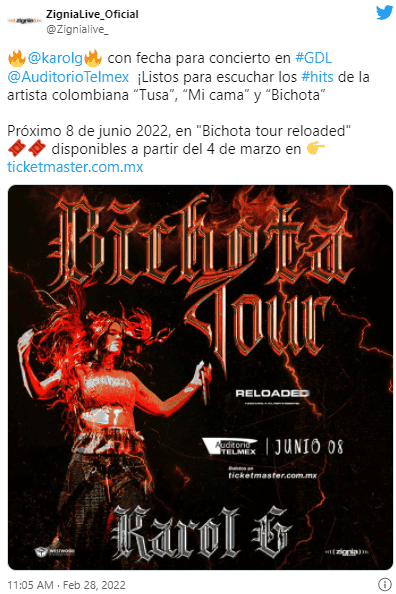 El reggaetón ha conquistado el país en este 2022: primero Maluma y Bad Bunny confirmaron concierto en México, ahora tocó el turno de Karol G.La cantante realiza desde el año pasado "Bichota Tour" por varias ciudades de Estados Unidos y ahora Latinoamérica disfrutará su versión Reloaded.En Puerto Rico, la cantante colombiana hizo historia al romper el récord de la artista femenina latina que más rápido ha vendido por completo dos funciones consecutivas para el Coliseo de Puerto Rico, en el que se presentó en noviembre pasado.Más de 60 mil personas participaron en la línea virtual de ticketera.com para comprar boletos del concierto en Puerto Rico, y ahora está por verse si logrará lo mismo para los shows que planea en México."Bichota Tour Reloaded" se presentará el 11 de junio en la Arena de la Ciudad de México; la preventa de boletos será el 4 de marzo.La cantante también se presentará en la Arena Monterrey, el 1 de junio, y en el Auditorio Telmex, de Guadalajara, el 8 del mismo mes.En su cuenta oficial de Instagram, Karol G publicó un video para dar a conocer la gira que hará por Latinoamérica, pero sin dar a conocer las fechas.La colombiana prometió que será este martes cuando se inicie la venta de boletos, aunque tampoco especificó cómo se llevará a cabo esta venta.AF