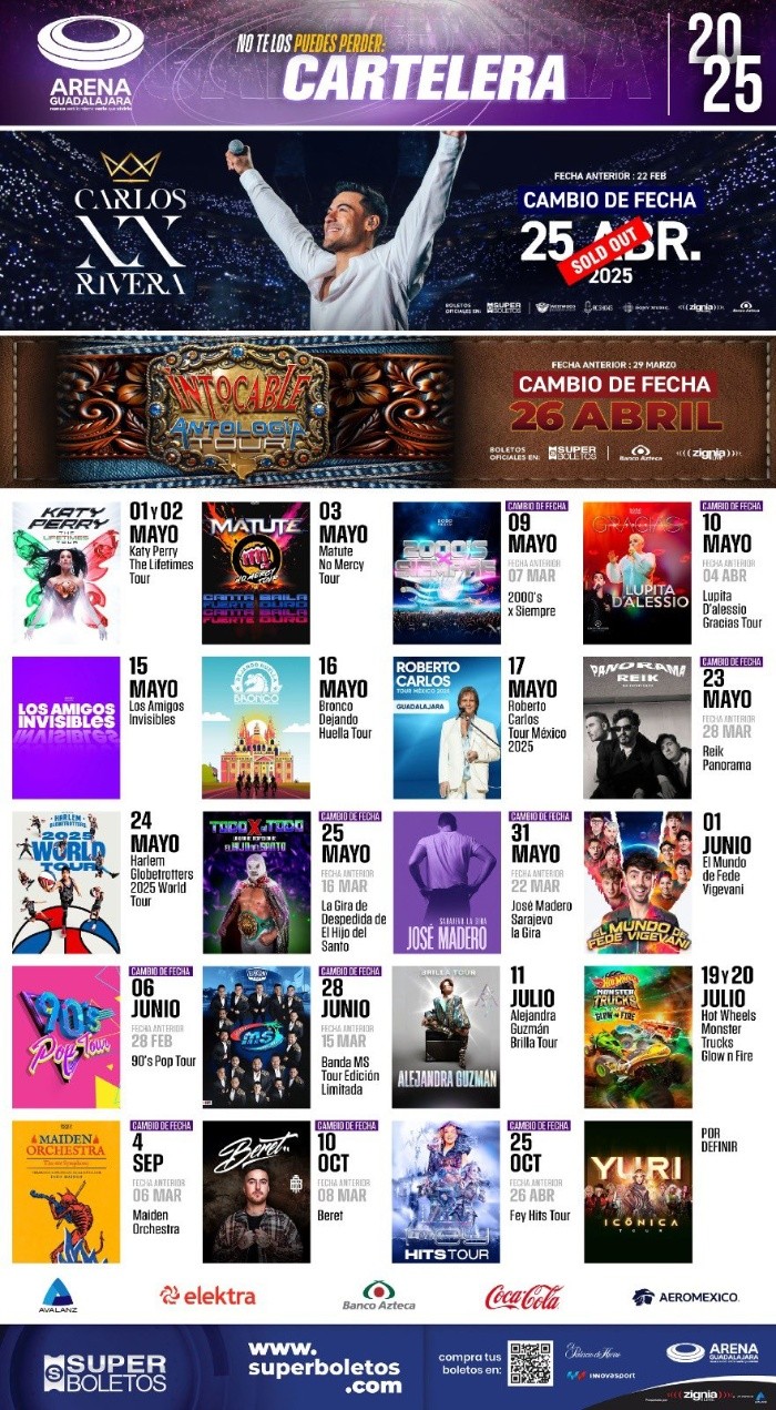 La esperada apertura de la Arena Guadalajara cambiará de fecha. Originalmente prevista para el 22 de febrero la inauguración del recinto a cargo de Carlos Rivera, se reprogramó para el 25 de abril de 2025, según informó la organización en un comunicado oficial."La Arena Guadalajara anuncia sus nuevas fechas para el inicio de operaciones que será el 25 de abril del 2025. Esto debido a que estamos optimizando el recinto más cómodo, tecnológico e innovador de América", se lee en el mensaje.La administración del recinto explicó que este ajuste permitirá realizar mejoras finales y garantizar que la arena cumpla con los estándares de calidad que la caracterizan. Además, aseguraron que el objetivo es ofrecer un espacio seguro y cómodo para albergar eventos de talla internacional.El cambio de fecha de inauguración impactó la agenda de varios espectáculos previamente anunciados. A continuación, las nuevas fechas oficiales:Yuri originalmente estaba programada para el 21 de marzo, sin embargo la nueva fecha está por definirse.Los eventos que no están mencionados no sufren de cambio algunoLas personas que ya adquirieron boletos para cualquiera de estos eventos podrán utilizarlos en las nuevas fechas sin necesidad de cambios adicionales.Sin embargo, quienes prefieran solicitar un reembolso podrán hacerlo entre el 1 de febrero y el 15 de marzo de 2025, enviando su solicitud al correo reembolsos@superboletos.com con los siguientes requisitos:El tiempo de respuesta para el trámite de reembolso será de 4 a 7 días hábiles. NA