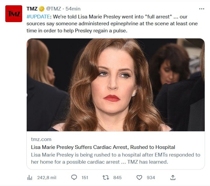 La cantante Lisa Marie Presley, la única hija de Elvis Presley, fue trasladada de emergencia a un hospital tras haber sufrido un supuesto paro cardíaco.Según el portal estadounidense dedicado a las celebridades TMZ, Presley, de 54 años, recibió primeros auxilios y fue asistida por paramédicos el jueves en su casa ubicada en Calabasas, California.Antes de ser trasladada, los especialistas médicos lograron recuperar el pulso de la cantante, pero hasta ahora no se sabe la condición de salud actual de Presley.Esta semana, la hija del astro del rock and roll fue vista en la gala de los Globos de Oro junto a su madre, Priscilla Presley, como acompañantes del actor Austin Butler, quien ganó el premio a mejor actor de drama por su papel de Elvis Presley en el filme de Baz Luhrmann.Lisa Marie Presley es la única hija del icónico cantante transgresor de rock and roll y es madre de cuatro hijos, entre ellos, la actriz y cineasta estadounidense Riley Keough.Presley siguió los pasos de su padre y en 2003, lanzó su primer álbum, "To Whom it May Concern", y a este le siguieron dos producciones más, pero desde 2012 no ha sacado ningún disco nuevo.JM