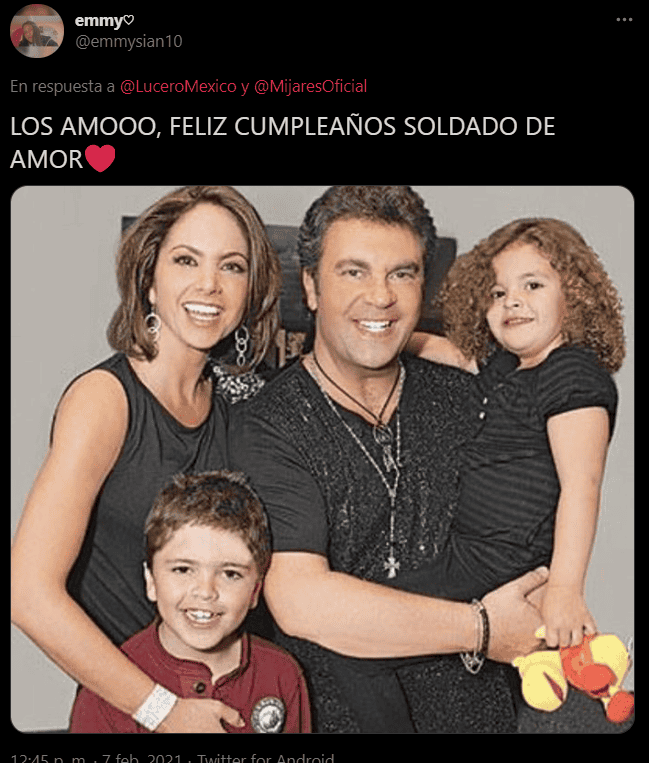 Lucero causó furor en las redes sociales al enviarle un mensaje de felicitaciones a su ex esposo Manuel Mijares por su cumpleaños este domingo 7 de febrero. Fue a través de las historias de Instagram y una publicación en Twitter que Lucero dedicó un emotivo mensaje a Mijares junto a una fotografía donde aparece el cantante abrazando a sus dos hijos, José Manuel y Lucerito. “¡Feliz cumple @oficialmijares lo mejor para ti, hoy y siempre!”, escribió Lucero en Instagram. “Que siempre vivas rodeado de amor y felicidad, que celebres tu día con salud completa y que así sea diario. ¡Abrazo y besos para ti, bendiciones y lo mejor de la vida Manuelito!”.La publicación provocó que muchos de los fans de ambos comentaran en redes sociales la buena relación que mantienen a pesar de su divorcio. Lucero y Mijares se divorciaron en 2011 y desde entonces han demostrado tener una buena relación por sus hijos.Recientemente, Lucerito —hija de “La Novia de América” y Mijares— lanzaron un sencillo navideño con el nombre “El Privilegio de Amar”.Asimismo, Lucero anunció que estrenará “Gloria a Ti”, junto a su hija. AC
