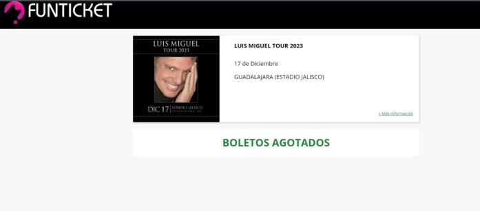 Luego de que se adelantara la venta general para el concierto de Luis Miguel en Guadalajara, se dio a conocer que los boletos para el espectáculo del próximo 17 de diciembre en el Estadio Jalisco se han terminado. Funticket, página oficial donde se llevó a cabo la venta de boletos para la perla tapatía, anunció hoy que la venta general se abriría en punto de las 15:00 horas debido a la alta demanda.Solo bastaron alrededor de cuatro horas para que los boletos terminaran, fila virtual en la que esperaban más de 300 mil personas buscando comprar sus entradas para el show.EL INFORMADOR accedió al sitio funticket.mx/ donde se pudo corroborar que los boletos se agotaron pues aparece el título de "boletos agotados". Hasta el momento no se sabe si "El Sol de México" abrirá más fechas para Guadalajara como lo hizo en Argentina y Chile. En otras ciudades como Aguascalientes, León, Morelia y Monterrey se terminaron los boletos.MF