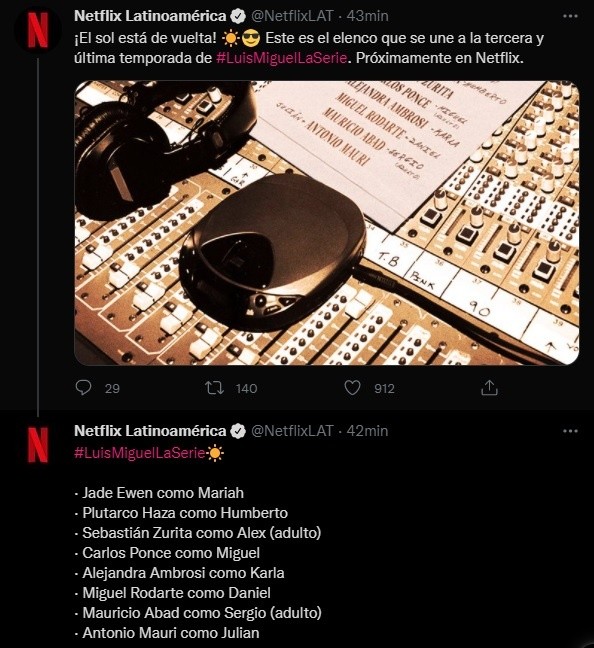 La mañana de este jueves, Netflix reveló el elenco de la tercera y última temporada de “Luis Migue, la serie”. Fue a través de redes sociales donde Netflix compartió la imagen de una consola de sonido y una hoja con los nombres del elenco.Además, se sabe que Diego Boneta regresará como Luis Miguel; asimismo regresan Juan Pablo Zurita, César Santana, Gabriel Nuncio, Macarena Achaga, Ferando Guallar, Pablo Cruz Guerrero, Juan Igancio Cane, Teresa Ruiz y Axel Llunas.***Si te interesó esta noticia y quieres saber más, entonces descarga y descubre INFORMAPlus, la aplicación digital de EL INFORMADOR, en donde tenemos contenidos exclusivos, seleccionados por nuestros editores, para darles una experiencia más completa a los lectores.Descarga la aplicación y pruébala GRATIS por treinta días.Para iOS: https://apple.co/35jaVgbPara Android: https://bit.ly/3gwVSEVSi eres suscriptor de EL INFORMADOR tu acceso está incluido, solicítalo al 33 3678-7777AC