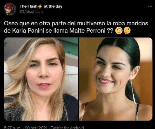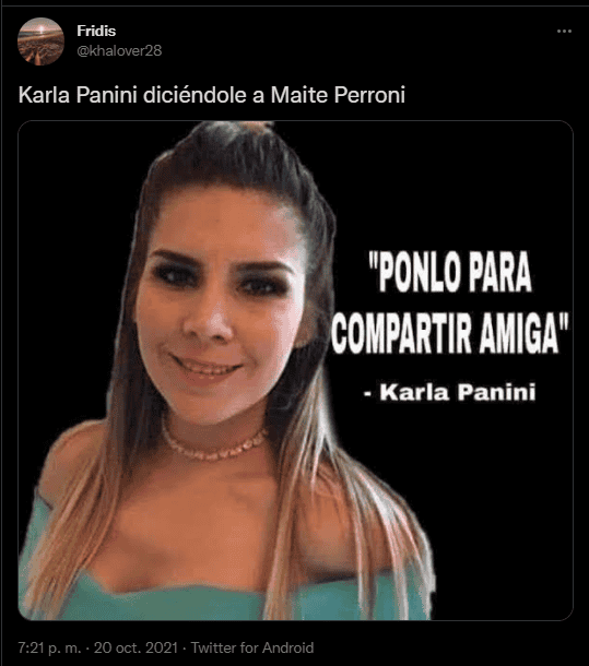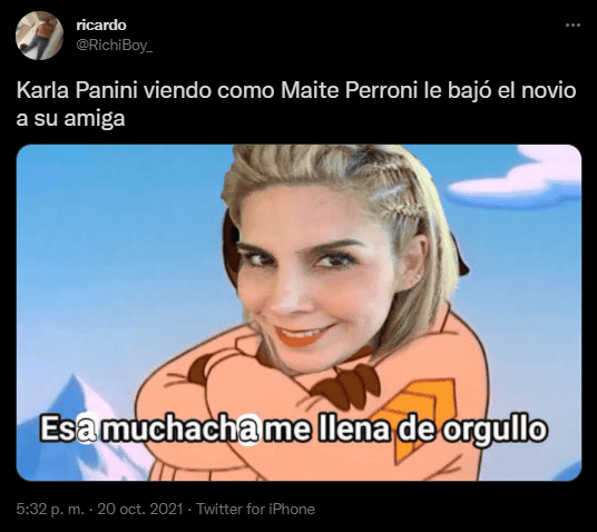 Luego de que esta semana, Maite Perroni y Andrés Tovar confirmaron que sí mantienen una relación amorosa, a tan sólo unos meses de haberla negado, ahora las redes sociales desataron los memes y comparan a la actriz con Kara Panini.Hace unos meses, Maite Perroni amenazó con demandar a Claudia Martín, la exesposa de Andrés Tovar, y a una revista, por haberla señalado como la tercera en discordia. Por su parte, Tovar, quien es productor en Imagen Tv, negó los señalamientos.Para quienes no lo conocen, resultó sorprendente que Andrés Tovar decidiera separarse de Claudia Martín apenas a un año y medio de haberse casado. Pero entre su círculo más cercano, la convicción con la que el productor de televisión decidió romper su relación con Martín y embarcarse en un nuevo noviazgo con Maite Perroni es solo una demostración de su personalidad.Una de las voces que se pronunció tras el anuncio del romance fue la escritora, Claudia de Icaza, quien dijo: "No tengo nada contra Andrés Tovar ni Maite Perroni, si contra el disimulo y la victimización. Lo que es, es y lo sostienes para no caer en contradicciones absurdas".Pero ahora que ya aceptaron su romance, los memes no los perdonaron e incluso, compararon a la exRBD con Karla Panini, quien se casó con Americo Garza, el exmarido de su amiga, Karla Luna.Karla Luna y Karla Panini se conocieron a principios de siglo en la televisión regiomontana: la primera informaba del clima y, la otra, integraba un programa de comedia.Las dos coincidieron en la emisión "El club" y comenzaron a llevarse bien, llamando la atención de los ejecutivos.Luna sostenía una relación con Américo Garza, con quien tendría tres hijos y Panini otra con el conductor y productor Óscar Burgos.De acuerdo con Luna, a ella se le ocurrió abrir una sección en que ambas platicaran a manera de chisme en un lavadero sobre el medio del espectáculo. Y fue un éxito.En 2012, tras dar a luz, Luna es diagnosticada con cáncer en la matriz. Panini cierra filas en torno a ella y la apoyó tanto emocional como económicamente.Dos años después Luna reveló tener pruebas de una traición de su amiga y esposo. Panini había aceptado haberle dado besos a su esposo y él, a su vez, enviaba mensajes.Panini, de acuerdo con los textos de celular, incitaba a Garza a que maltratara a Luna, pues no soportaba verlo tratándola bien.Ahí fue el rompimiento total. Luna continuó dando giras por la República con su personaje y Panini se refugió en la venta de artículos de belleza y la fe.En 2016 Panini y Garza contrajeron matrimonio. En 2017 Luna fue derrotada por el cáncer.AC