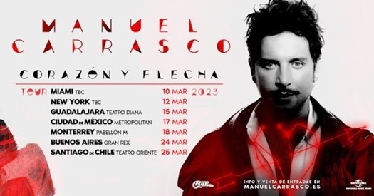 Tan solo unos días después de comunicar las primeras fechas en España y conseguir el sold out en el Estadio La Cartuja de Sevilla en apenas media hora, Manuel Carrasco anuncia las primeras fechas de su “Tour Corazón y Flecha” en América Latina y Estados Unidos.En Guadalajara se presentará el 15 de marzo del 2023 en el Teatro Diana y los boletos pueden adquirirse por Ticketmaster. En Ciudad de México estará el 17 del mismo mes en el Teatro Metropolitan y el 18 en el Pabellón M en Monterrey. Además, estará visitando Miami, Nueva York, Buenos Aires y Santiago de Chile durante el mismo mes de marzo.Sin duda una etapa muy feliz para el artista que tras lograr en la anterior gira el récord de afluencia de un artista español a un concierto, o conseguir el sold out de su primera fecha en España en apenas media hora, también recibía hace unas semanas varios premios como el Golden Music Award por los 40 Principales a su trayectoria musical o recientemente el Ondas al mejor espectáculo por el concierto de clausura de su gira 2022, dónde conseguía reunir a 74 mil 345 personas.Además, el artista fue el encargado de la apertura de la ceremonia de entrega de los Premios Ondas 2022 en El Teatre Del Liceu De Barcelona, con una interpretación impecable de la canción “Y Soy”, un tema simbólico porque el artista isleño se lo dedica a su tierra Isla Cristina, en su nuevo disco “Corazón y Flecha”.FS